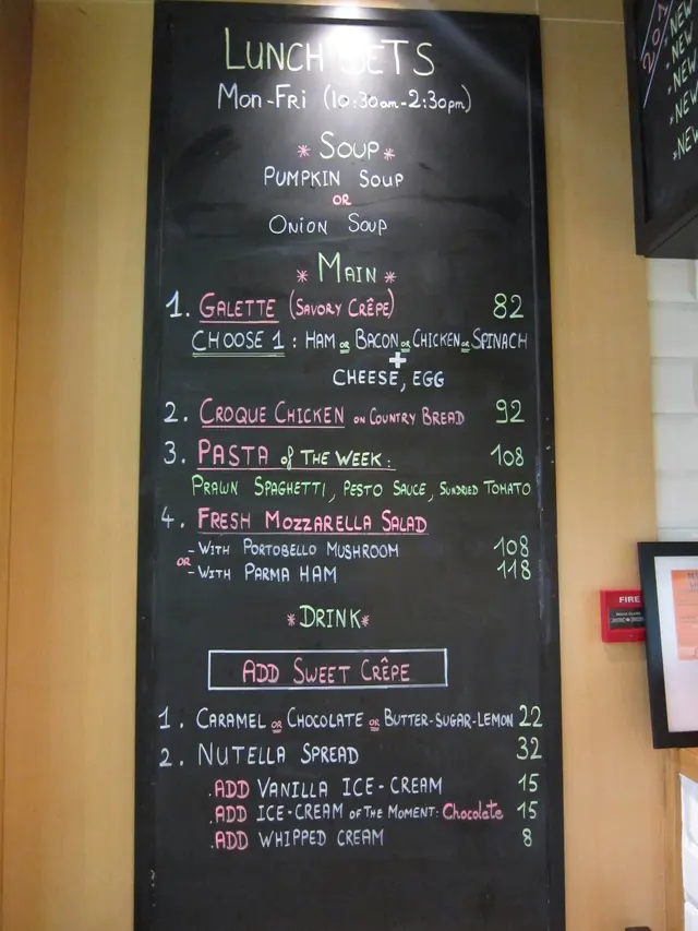 平日的Lunch set,包括餐湯及飲品,主菜可選擇鹹的可麗餅、意粉、沙律等,價錢由$82-$118。另外加配甜點,甜的薄餅另加$22,NUTELLA榛子醬則另加$32。價錢算是合理。週末則有Breakfast Sets及Brunch Sets。Breakfast Sets供應時間為早上9時至早上11時半,Brunch Sets供應時間為早上9時至下午5時。Brunch Sets分為三類:可麗餅(價錢由$95-$115)、水煮蛋配法國麵包(價錢由$115-$125)、意粉等等。Brunch Sets-English breakfast Galette($105):配料有煙肉、雞蛋、蕃茄、艾曼托芝士、蘑菇等。可麗餅是用蕎麥粉製成,餅皮薄且軟,充滿蛋香。可麗餅裡面還有很多煙肉塊,材料富足。Brunch Sets-Egg Royal on country bread ($125): 配料有煙三文魚、菠菜、水煮蛋、荷蘭醬等。材料新鮮,水煮蛋是Hard-cooked,蛋黃蛋白是全熟的,吃起來有雞蛋的香味和口感,不是煮過頭。法國麵包的邊皮香脆,且有咀嚼感,麵包內裡富彈性。炎熱的夏天,當然是要order透心涼的 Smoothies。味道主要是香蕉、草莓、熱情果、黑加倫子味等。椰子芒果熱情果奶昔: 熱情果味最為突出,微酸。蘋果黑加倫蜂蜜奶昔: 奶味較輕,黑加侖子味道很突出,改用蜂蜜代替糖漿,更為健康。…查看更多