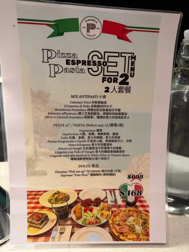 主打手工薄餅正宗意大利味,食材入口新鮮,二人套餐$468超值(小食+pizza/pasta+甜品+無限espresso小食拼盤五款香脆開胃(視覺豐富份量足,配酒一流):- 炸新鮮魷魚:外脆內Q彈海鮮鮮,蒜粉微辣不油膩,咬落juicy解饞!- 自製雞肉炸丸子:雞肉嫩滑裹脆皮,香草調味簡單鹽香,熱騰騰暖胃。- 烤麵包配自製番茄莎莎醬:麵包金黃鬆脆,莎莎醬新鮮酸甜豐富,配多士清新飽肚超match。- 煙三文魚配酸豆、檸檬+特級橄欖油:三文魚煙燻香軟滑順,酸豆脆爽提鮮,中央加朝鮮薊、橄欖、意大利咸魚主菜選二(pizza+pasta最佳,意大利入口食材自家製):- Italia Pizza(白菌、香腸、意大利辣腸、青椒):餅底薄脆不濕軟,芝士適中拉絲香濃,配料豐富juicy,烤出微焦邊緣辣香入味,做得出色必點!- 雜錦海鮮意粉配白酒汁:意粉al dente吸滿白酒汁奶香微酸滋味,海鮮新鮮有四隻蜆、兩隻蝦、魷魚等…Read More