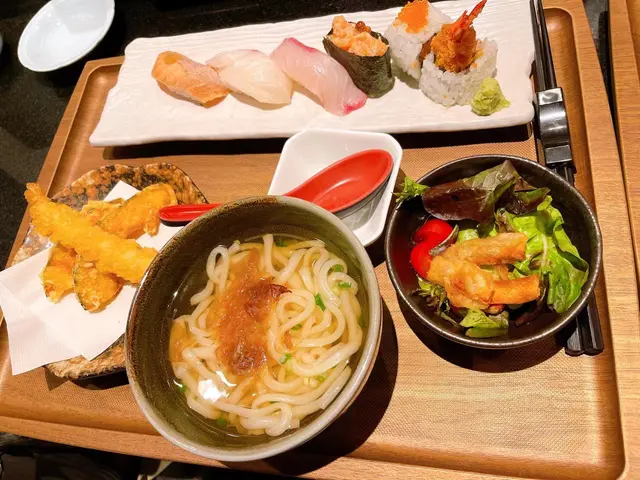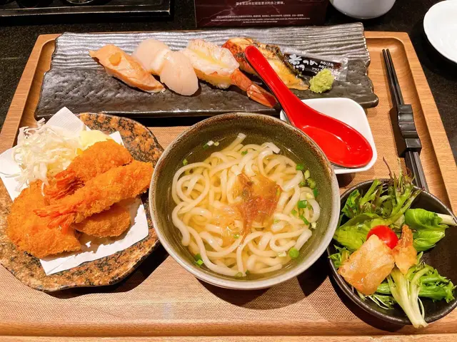 濃縮的日式風味精華【A珍壽司•烏冬定食】珍壽司以新鮮刺身為核心,如三文魚、吞拿魚等握壽司,魚肉細膩豐腴,醋飯酸度恰到好處,入口清爽不膩。搭配的烏冬面彈牙有勁,湯底以昆布、木魚花熬制,鮮甜中帶微鹹,撒上蔥花和海苔絲提味,暖胃又滿足。定食還包含味噌湯、蔬菜沙拉和秋葵,組合均衡,適合喜歡輕盈口感的食客。【B炙燒壽司-牛肉烏冬定食】炙燒壽司是焦香與鮮美的雙重奏:三文魚腩經火槍輕炙後表皮微脆,油脂香氣四溢;帆立貝表面焦香內裡嫩滑,搭配微甜醬汁層次豐富。牛肉烏冬的牛肋條肉軟嫩入味,吸飽醬油與味啉調和的濃郁湯底,烏冬面掛汁勁道,配菜天婦羅蝦外脆內鮮,整體鹹甜交織,濃烈風味令人滿足。兩款定食均體現千兩對食材新鮮度的堅持,性價比突出,無論獨食或簡餐都能感受到濃縮的日式匠心。…查看更多