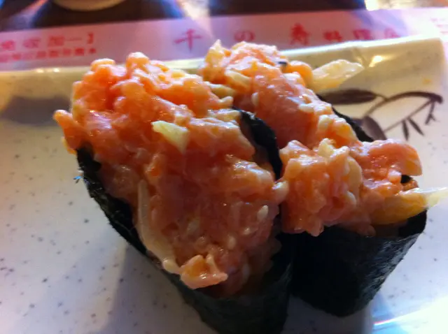 六時多到了千之壽吃飯,可能太早,人不多,跟大馬路的壽司店大排長龍截然不同選了辣味三文魚壽司再加$18要了拉麵這裡的壽司比元朗其他店鋪的貴其他店鋪賣的是”抵食夾大件”這裡又如何先點了的辣味三文魚壽司三文魚碎沒有辣味而且感覺不太新鮮不太好吃呢!也不欲再多點其他壽司了……再來的拉麵,湯底較淡麵不夠彈牙,有點”腍”又是一般這裡的壽司已比元朗出面的貴質素又一般而且位置較偏遠實難以與元朗其他壽司店爭長短!…查看更多