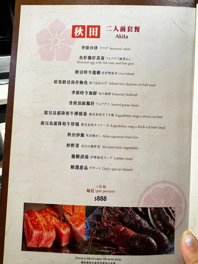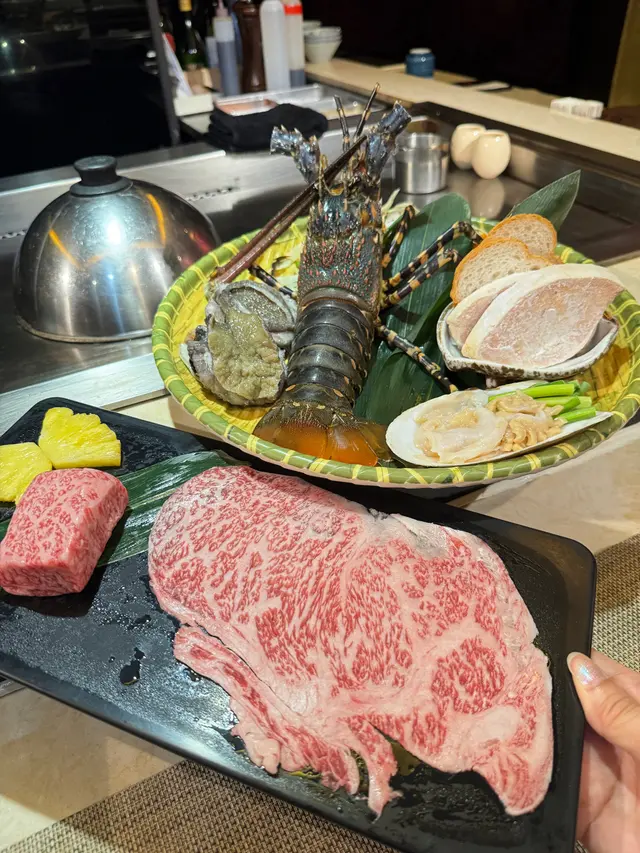 喜歡吃鐵板燒,因為可以看到師傅即席表演廚藝,不亦樂乎。秋田二人前套餐,每位$888,有齊龍蝦、鮑魚、象拔蚌、鵝肝及和牛厚、薄燒,CP值高。處理龍蝦時還有火焰表演,夠哂打卡able。先上季節沙律,沖繩水雲涼伴,搭酸甜醬汁,上配一塊薄鮑魚,揭開美食序幕。魚籽鵝肝蒸蛋,蒸蛋滑溜,配上黑魚籽和略煎香的鵝肝粒,脂香四溢。主角鮮活時令龍蝦上場,師傅現場表演拆肉,還表演火燒龍蝦頭。龍蝦生猛,肉質細嫩,搭配龍蝦膏醬汁,回味。之後是原隻鮮活南非鮑魚,煎香再切片,與忌廉海苔醬搭配,鮮味十足。今晚季節是令海鮮是象拔蚌,師傅駕輕就熟將象拔蚌片輕輕炒香,非常香口。厚切鵝肝表面煎至焦香,外脆內軟,入口即溶,搭配黑醋和菠蘿,減低油膩感。鹿兒島霜降和牛薄燒和厚燒:薄燒和牛包著洋蔥、香蔥和乾蒜片,香口之選。厚燒和牛將牛味更昇華,師傅控制火候控制得不錯。秋田炒飯加入了櫻花蝦乾、香蔥、煙肉和甘筍,炒得粒粒分明,好味。炒野菜,口感爽脆。龍蝦清湯,用龍蝦頭煲的麵豉湯,味道清甜。最後是精選甜品,估不到師傅也很有心思,是銅鑼燒夾住紅豆餡,再配抹茶和豆腐雪糕,捧腹離開,非常滿足。…查看更多