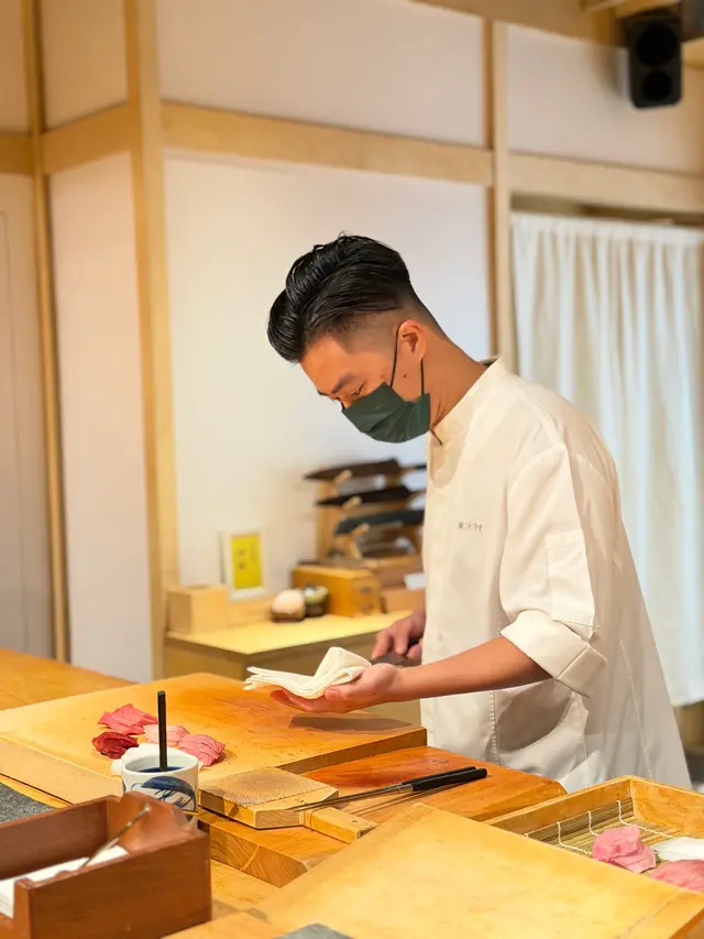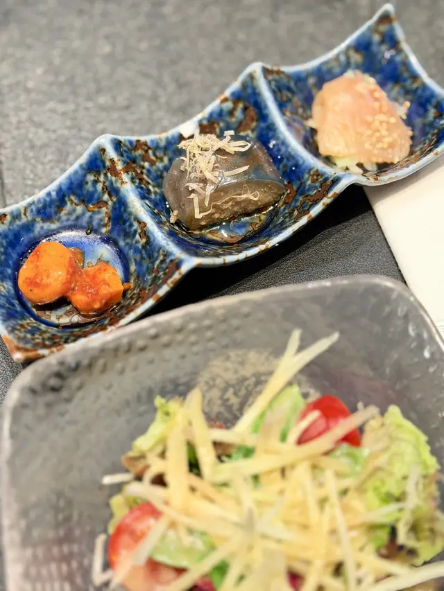 上環鮨定山午餐也太好食了吧🍣收藏很久的「鮨定山」,終於約到午餐位!進店就愛了——環境乾乾淨淨飄著淡淡的海味🌿,師傅在吧台里切魚超利落🧑🍳,服務員會主動添茶換碟,關鍵是人均友好💰,吃完直接想把它列入“每周必吃清單”!.💫 餐前小食:一口開胃!鱈魚片脆到咬著“咔哧”響,裹著沙律醬一點不膩,第一口就把食慾勾出來了~本來以為是小配角,結果被我秒光👍.🔸 茶碗蒸:鮮到驚喜!滑嫩得像布丁一樣,!咬到蝦肉的時候鮮到眼睛亮,每勺都有蛋的軟和蝦的鮮味.🔸 鹿兒島午魚:油脂香絕了魚肉嫩到一抿就化,油脂香超濃但不膩!配的自家醬汁太懂了——蘿蔔葉、芥末籽、洋蔥做的,酸甜甜裹著魚香,吃完嘴裡還留鮮🤤.🔸 九州赤貝:脆彈到上頭赤貝顏色亮堂堂的,咬著脆彈得能彈牙!配的沖繩水雲軟滑軟滑的,脆和軟搭在一起,口感一下就豐富了🥢,鮮甜味超濃~.🔸 重頭戲海鮮&壽司:每口都是鮮!- 春子鯛:魚肉透白嫩紅,嚼著有彈性,鮮得很清爽,完全沒有腥味🍣- 車海老:蝦肉滿到塞嘴!咬著彈牙又甜,鮮得像剛撈上來的,連蝦殼都想嗦乾淨🦐- 醬油漬中拖羅:顏色紅亮誘人,脂肪比例剛好,咬著不膩,鮮甜味超足,我連吃兩片都不夠👍- 北海道紫海膽:份量超實在!挖一勺絲滑得像奶油,甜里帶點海的清香,一點不腥,空口吃超滿足😋- 大拖羅:我的最愛!脂肪像雪花一樣化在嘴裡,魚油香裹著鮮甜,吃完還在回味,連師傅都笑說“看出你喜歡了”😍.- 秋刀魚:時令的就是不一樣!魚肉滿是油脂香,咬著甘甘的,吃完嘴裡回甜🤗,連魚骨都煎得酥- 拖羅太卷:色彩超好看!一口咬到拖羅、海老、瀨尿蝦,鮮甜味層層疊,玉子的甜和水雲的軟滑超搭,拍照也出片📸- 面豉湯:豆香超濃!喝著咸鮮適中,暖乎乎的一碗下肚,胃里超舒服🥣🍧 甜品:收尾太治癒焙茶雪糕太絕了!溫溫的堅果香混著茶香,還有點淡淡的木質感,配著糯嘰嘰的蕨餅和甜紅豆蓉。真心推薦!食材新鮮到能吃出海的鮮甜,師傅會跟你聊魚的產地,服務也不敷衍,午餐吃撐還不貴。已經約了朋友下次來試晚餐,想想師傅現切大拖羅就饞🤤!…查看更多