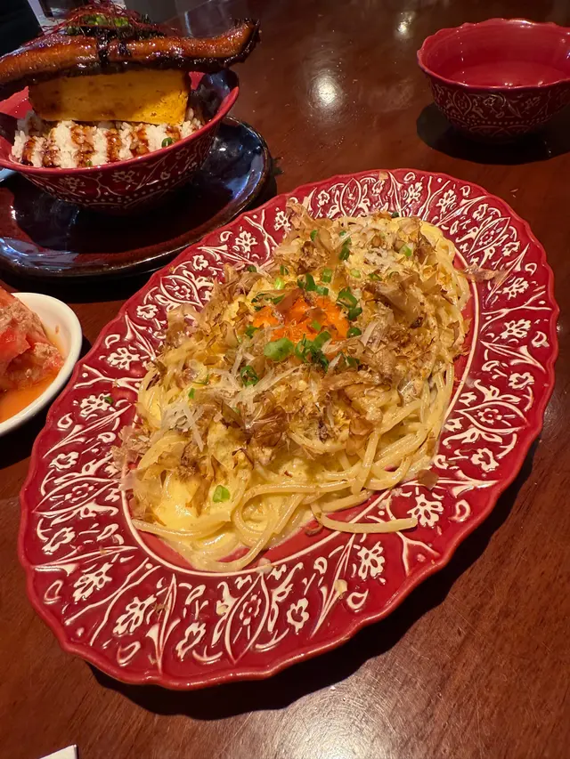 @大埔喫茶今日同朋友嚟到一間好特色靚裝修嘅日式Cafe 唔記得影個餐牌好靚朋友話想食鰻魚蛋丼飯,估唔到一上菜咁靚條鰻魚彈吓彈吓咁,仲有厚切嘅蛋口感絕對一流,珍珠米配上鰻魚汁大大口感食落去,好滿足另外叫咗日式意粉,日式芝士配上蛋黃漿香滑無比,我較鍾意呢一款,每個餐都可以叫一杯特色飲品,嗌咗兩款梳打飲其中一款裏面有金魚造型嘅啫喱,外貌好得意,朋友不佢上來,就好似撈金魚咁,一於表演撈金魚另外嗰杯就係水蜜桃味梳打水有幾OK喎間餐廳環境一流,打卡一流但嘢食未到略嫌一般,外貌取勝!試過一次還可以🤣…查看更多