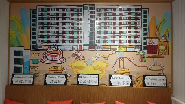 一踏入冰室就看到霓虹燈招牌及鐵皮信箱滿滿的老香港情懷小B 嚷着要坐在壁畫前謝謝冰室職員特地幫我們安排一個舒適闊絡的位置呢~細心看看,壁畫也是充滿香港特色呢~例如屋邨啦、奶茶啦、蛋撻啦、西多士啦、凍檸茶啦、紅豆冰等等超可愛的!!小B 對這個奶茶兔兔 Cushion 愛不釋手呢~