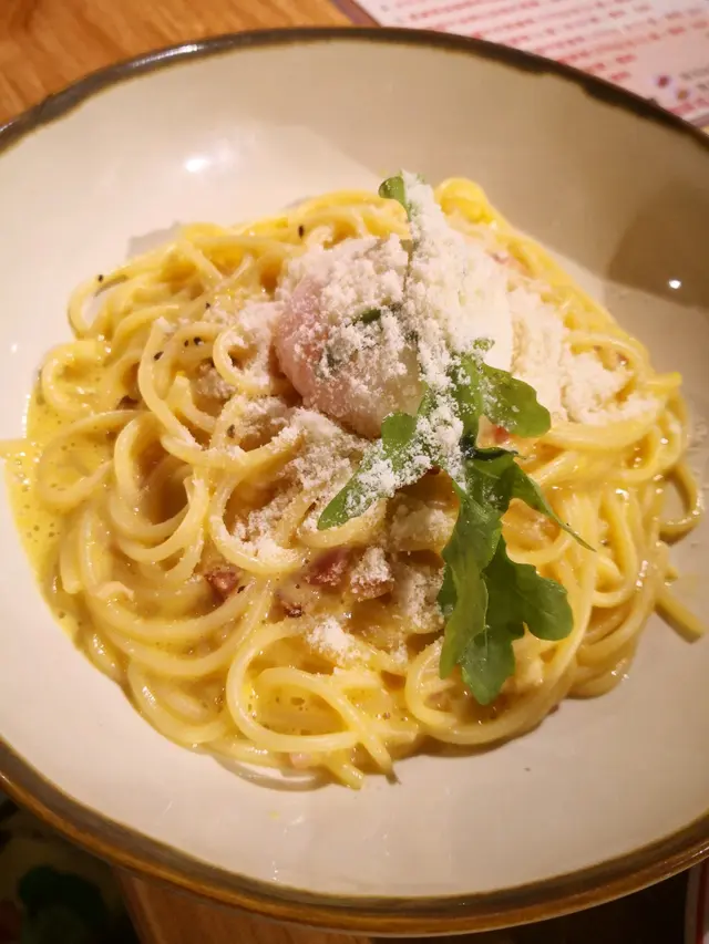 咁啱附近餐廳冇位見呢間新開又淨返幾枱,就諗住試試佢餐牌簡單得2面 店員俾左個QR code 我地自己落單都幾方便卡邦尼個蛋汁做得幾夠意粉份量幾足溫泉蛋好滑又配