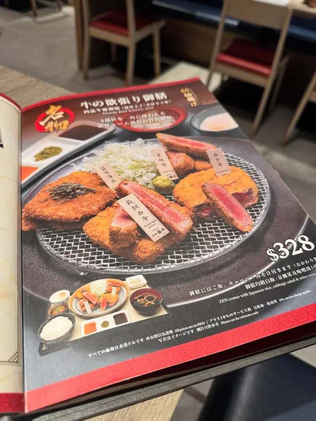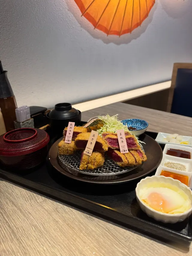 這間食吉列牛專門店,日系的裝修,環境闊落舒服。必食他們的四品牛魔御膳,一試過食晒4款吉列牛,有菲力牛、穀飼西冷、翼板牛及醬味薄牛,餐廳以190°C油溫炸60秒,將外層炸至酥脆金黃,而內邊的牛肉仍維持著3分的熟度,配備烤架,可按自己喜好燒至生熟程度,搭配著九種不同的調味(日本溫泉玉子、山葵、京咖哩蘸醬、牛排特製醬汁等)。御膳會配白飯,味噌湯及椰菜沙律。熟成厚切豚肉鍋膳,厚切的豚肉,肉質軟而粉嫩,外層炸至金黃酥脆,內邊層次分明,配撘滑蛋及甜醬油,很好送飯。他們的特飲及甜品都很吸引。推介特濃抹茶蛋糕👍…查看更多