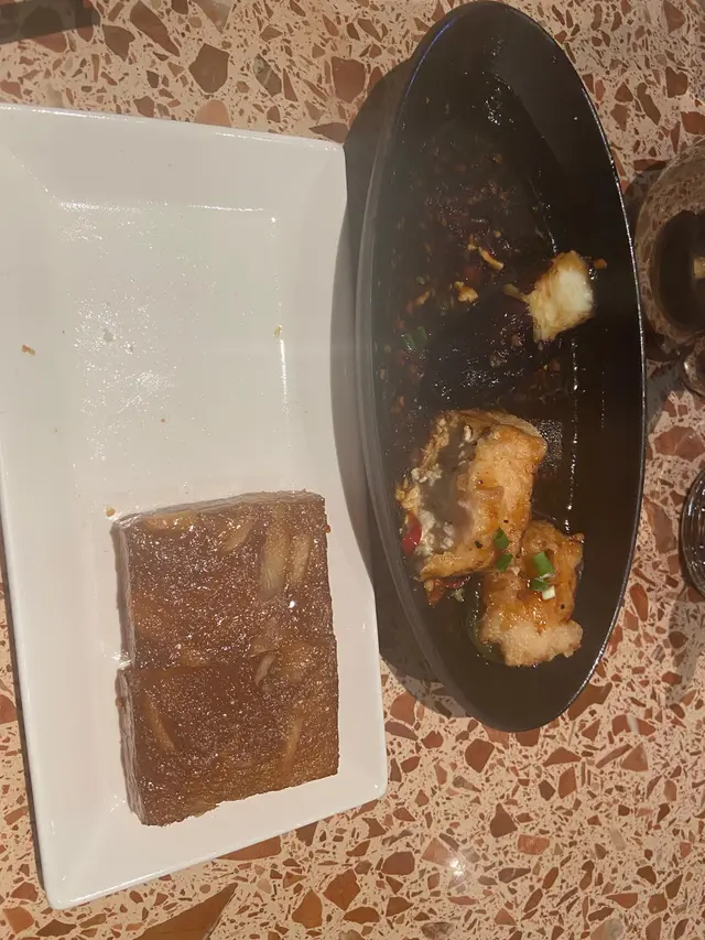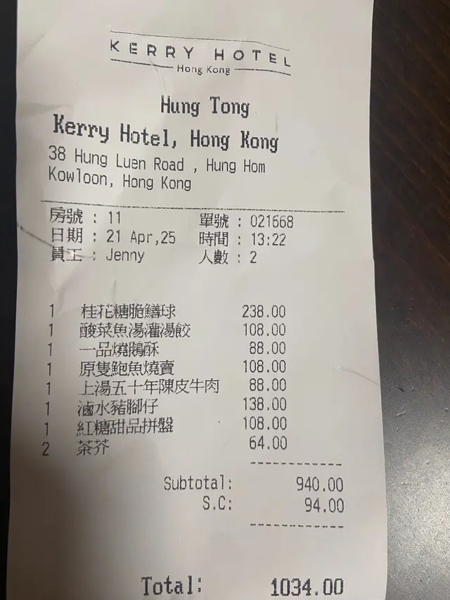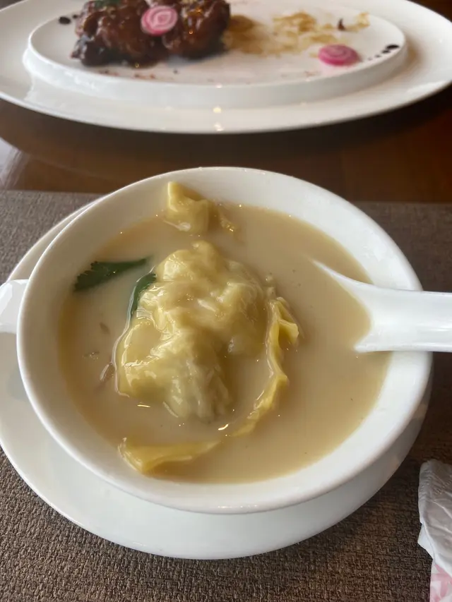 時間: 星期六12:00等候:0 預先電話訂座服務: 細心 配得上酒店質素,查問客人忌口,主動提示上菜時間,主動幫客人「針」茶食物:點心三樣 : $78-88 /點心1) 羊肉祼 孜然味好重,配酥皮焗,羊味好重 如果愛孜然羊肉,可以一試。(我個人麻麻) 2) 紫薯眉豆素餃 紫薯味不重 配沙葛好爽口,如果眉豆再多一點 豆香重一點 就完美 3) 牛肉球 這個不推薦 牛肉味不濃 仲食到少少梳打粉味,好似普通酒樓質素。片皮鴨3食 半只 $798 需要等70分鐘 先上炒鴨鬆 - 好乾身 有鑊氣 切得好碎,配大豆芽,包生菜🥬 幾好食 豆腐鴨湯 - 正常發揮 不驚喜 片皮鴨半只- 果然招牌菜,師父分開 淨皮 皮連肉 淨肉, 淨皮令人好驚喜,鬆化脆皮 不油膩 就算不夾餅皮 都好好食, 的確好少餐廳食到咁鬆化的脆口。 淨肉也不粗糙,雖然算不上嫩滑,但算不錯。龍躉皮蛋脆米湯飯$298 這個真心推薦,性格比超高,份量足夠4-6人,龍躉魚片數量不少 10片左右,脆米分開上 非常脆口 放湯有「渣渣」聲,湯飯絕配。 各人都好讚賞這道菜。甜品: 1)柑桔紅棗麻薯 - 常溫偏凍,吉士柑桔軟心,可以一試2) 芝麻湯丸批 - 可以不試,普通湯丸包住蛋撻皮,芝麻又不夠熱和流心,有點失望總結: 用餐體驗好滿意,員工服務好積極 細心,雖然點心和甜品未有驚喜,反而主菜好好,值得推薦