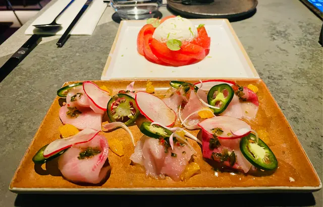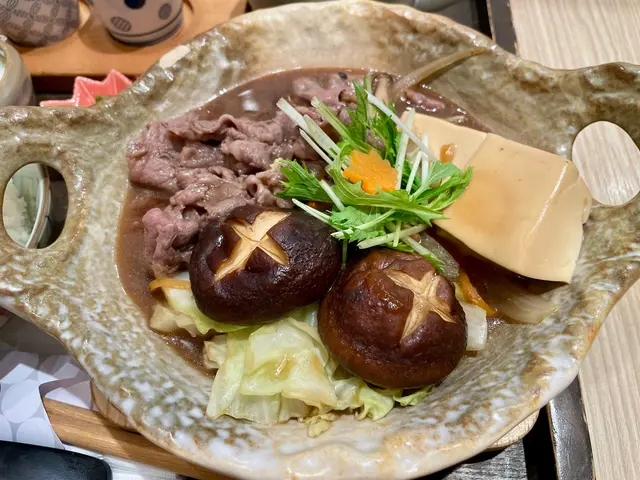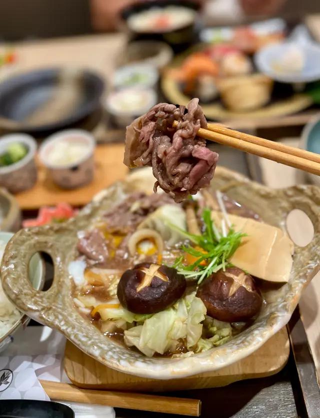行完街見呢間餐廳晚市早段已經有唔少人,一於試下。西日式餐廳格局,卡座位舒適唔迫。先講和牛肉壽喜燒,脂肪分佈均勻,煮完仲keep住嫩滑,牛肉味濃好好食!撈埋蛋汁食入口更軟更嫩!伴菜有有埋野菜同豆腐,飽肚得嚟唔會太膩,如果熱著上一定更出色。再嚟壽司8件配迷你櫻花蝦烏冬,壽司造型唔錯,三文魚、帶子、蝦都好新鮮,醋飯鬆軟唔會散。加埋個迷你烏冬濕濕口夠晒好配搭,伴有櫻花蝦脆卜卜撈埋一齊食,成件事更加惹味~炸南瓜餅外脆內軟,咬落係滿滿南瓜蓉甜味,點埋沙律醬仲邪惡又滿足~跟餐追加嘅抹茶提拉米蘇(+$42)幾抵食,抹茶粉微微甘苦平衡咗甜味,餅底濕潤,啖啖綠茶香,好啱綠茶控!另一跟餐加咗蕃茄胡麻沙律(+$28),冰鎮蕃茄超爽口,胡麻醬香濃撈埋洋蔥絲好開胃~+$20蘋果汁就正常發揮,解膩一流。 見到好多人點芭菲好吸引,下次再試過。…查看更多