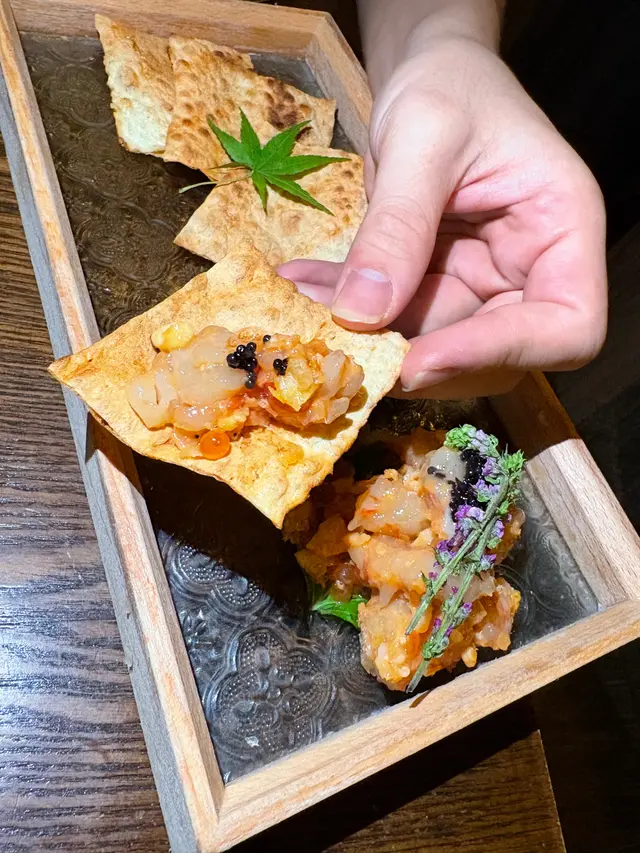 土佐豆腐$68私心推介一定要試下呢個! 佢特別既地方係柴魚碎碎痴埋一齊拎去炸, 超有口感,勁豐富, 有少少外脆內嫩既FEEL!加埋啲日本醬汁真係好正黃金焗蠔$68超鮮甜又勁大隻,唔腥! 啲醬有啲似卡邦尼有好多煙肉好正又夾~~賣相都係好靚!日本雞頸肉$38啖啖肉,燒得好嫩滑,$38有兩串都好抵食!甲羅燒$88超足料既甲羅燒,勁多蟹肉,中意食蟹肉一定要叫!再配埋燒過既鱈魚片超夾,口感豐富!八焱卷$128有海膽,燒過既鵝肝加埋紅酒蕎頭,口感豐富有層次, 中間仲有少少吞拿魚蓉同生菜包住,真係好正😍😍一定要食!!牛肉稻庭烏冬$108烏冬係用稻庭烏冬, 好幼身, 牛肉份量都OK, 湯底清甜唔錯, 再加啲7味粉更加惹味紫蘇雞皮蝦$58無唸到紫蘇葉拎痴住蝦一齊燒係甘有風味!!雞皮炸到脆卜卜好特別~…查看更多