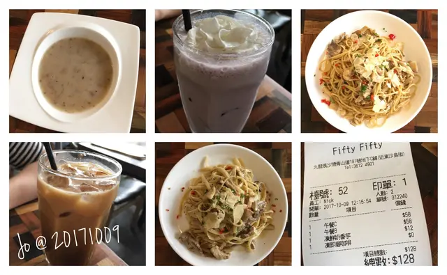 不過不失的西餐廳 Fifty Fifty 2017-10-16 難得星期一外子放假,所以就出城覓食。原本諗住好好記錄,寫好食評,以作開首。誰知發生了動魄驚心的小事(是矛盾的~事是小,但嚇左一餐),乜都忘記了⋯⋯ 中午12點到逹餐廳,因為未到午膳時間,所以人並不多,直入。計埋我倆,2隻手數哂。 第1次到Fifty Fifty,環境不錯,位子算是寬敞,而且乾淨企理,侍應們都好友善。 點了2個Lunch Set,我覺得價錢算是合理,有選擇,即使係最平的餐,也不錯。餐湯是蘑菇湯,味道尚可,但不夠濃郁,而且唔夠熱,感覺差點。2個意粉的分量夠,味道其實是不錯的,但有少許乾,多少少汁或者加回唔少分。飲品是香芋Latte &咖啡,不過不失。 我地食到1點幾LunchTime,開始有上班族幫襯,所以我諗如果想去Hea,都要睇住時段喇~…查看更多以上食評乃用戶個人意見 , 並不代表OpenRice之觀點。讚好分享不過不失的西餐廳 Fifty Fifty https://s.openrice.com/QrbT0p2Si00檢舉 張貼 評分4味道5環境4服務5衛生4抵食用餐日期2017-10-09用餐途徑堂食人均消費$64 (午餐)