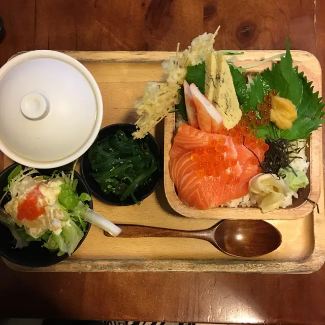到個主角,起初睇佢賣相以為好正,點知一食落口即刻想走,個飯係尖米加珍珠米泥嘅喂!口感怪仲要偏凍冇醋味,食落每啖飯都好硬。三文魚大塊但個味同口感偏膠,不是滑質,入口舒服的口感。海膽味道淡,沒什麼鮮味。配菜有蛋,蟹柳,味道尚可,正正常常。旁邊的天婦羅用麵條炸成,食落去奇怪,只拎了一條吃,但係十級懷疑佢唔食得,如果食得,我會俾多個嬲佢~總括而言包裝個樣勝於真實味度!唔值得再食!