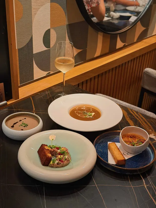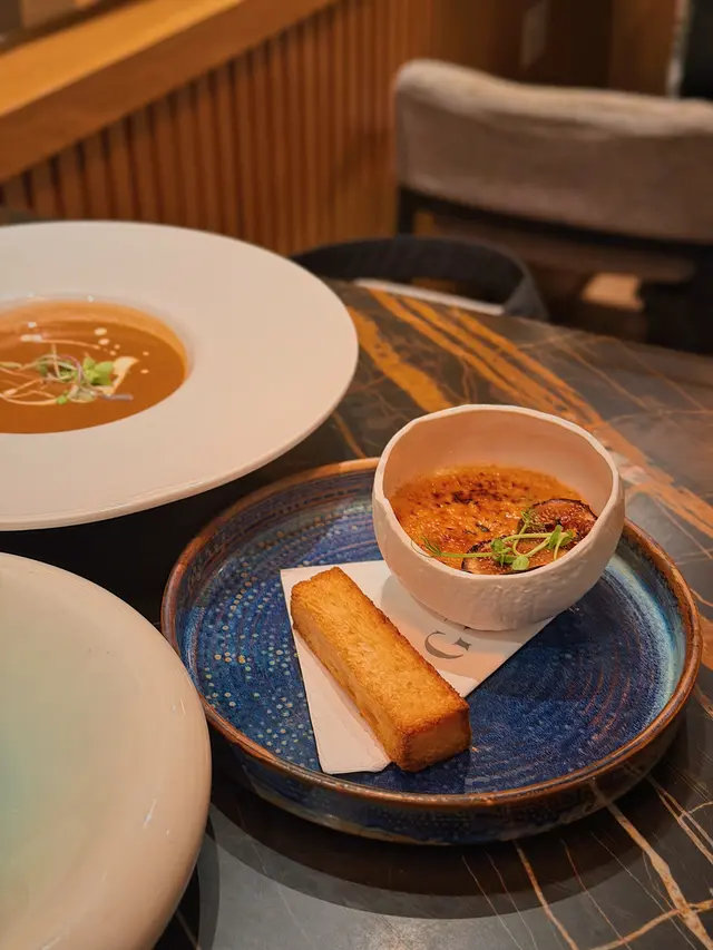 我哋揀咗二人套餐 再升級部分菜式 前菜升級咗鵝肝焦糖燉蛋同牛肉他他配法式千層薯