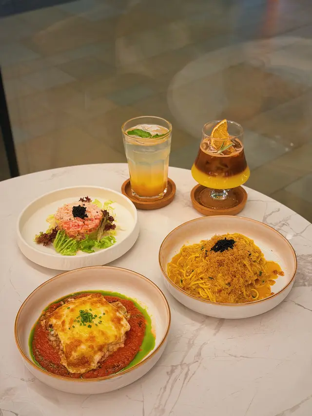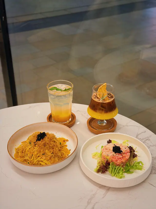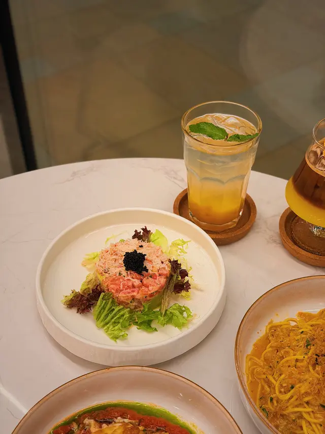 入口先係橙汁果香 再滲出濃郁咖啡味 清新解膩😆季節限定 蟹黃醬手工意粉配松葉蟹他他🦀