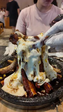 This is my first time trying a shop that specializes in pork ribs, and I can definitely say it met my expectations. The staff were super friendly and attentive. The food portion is HUGE, and you can expect to be stuffed (legit can't walk after my meal because it was that big!). maybe i underestimated the portion, but that’s on me. 1 portion of the pork ribs (the smallest one) is definitely enough for 3-4 people.I tried their signature pork ribs, and beneath the mountain of ribs, you can find fried rice that complements the sauce really well. The spicy sauce is sweet and spicy, the kind you’d expect from Korean cuisine. The charcoal taste really shines through the dish in a good way.They also kindly gave us some fish cake soup, which I personally really enjoyed (huge fan of fish cake soup btw). My only minor complaint is probably the fact that the cheese on top of the pork ribs is an extra charge (for around 48hkd, which is quite steep) but i really think it is a must have in the dish (kinda a showstopper too). Would come back with more friends!…查看更多