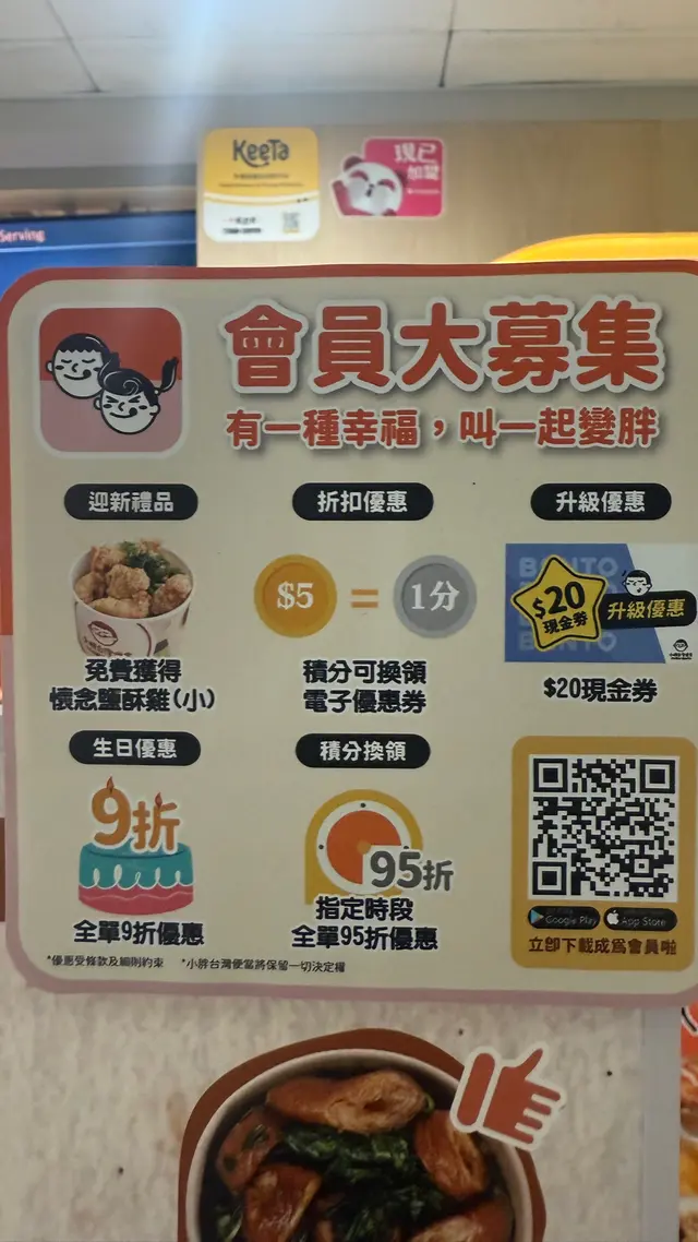 好耐冇去過台灣,今次就同朋友嚟食下台灣嘢,咁我哋就叫咗個二人餐落單果陣見到佢有個小胖會員app,有迎新優惠同升級優惠,每次食野都可以儲分,$5=1分,所以我地就Join左,立即儲分,同埋佢有增值預付卡,增值愈多回贈就愈多,成日食嫁話都好抵,可以做飯堂⭐️夜市炸魷魚口感非常脆,淡淡嘅鹹香味,令到魷魚嘅鮮味更加突出⭐️台灣鐵路大便當排骨大大件而且數量都好多,口感柔軟,每個便當都有粟米、滷蛋等食材,令到整體更加豐富,台灣風味十足⭐️紅燒牛頰肉牛肉整到好入味,而且肉質都好嫩滑,應該係用咗新鮮同優質嘅牛⭐️芙香蘋果茶聞落已經有淡淡的蘋果清香味,飲落更加一種清新嘅感覺⭐️熱柑桔檸檬茶金橘檸檬味道濃郁,潤喉首選原來除左堂食外, 佢仲有PARTY外賣團餐優惠,2日前預訂就有便當套餐都只係$62起,買得多仲有折✅60個起 8折✅40個起 85折✅20個起 9折搞gathering 果陣, 絕對可以考慮下…Read More
