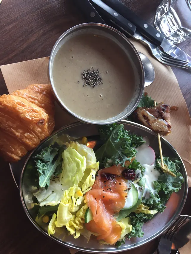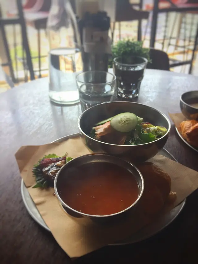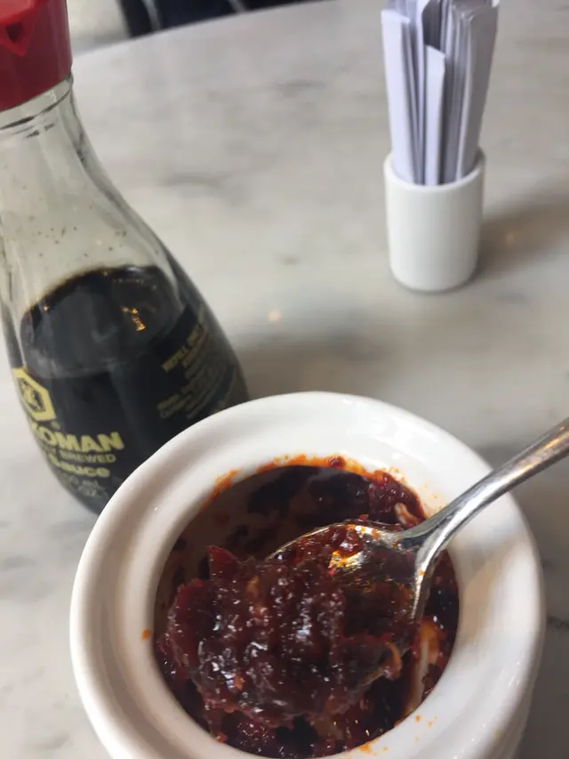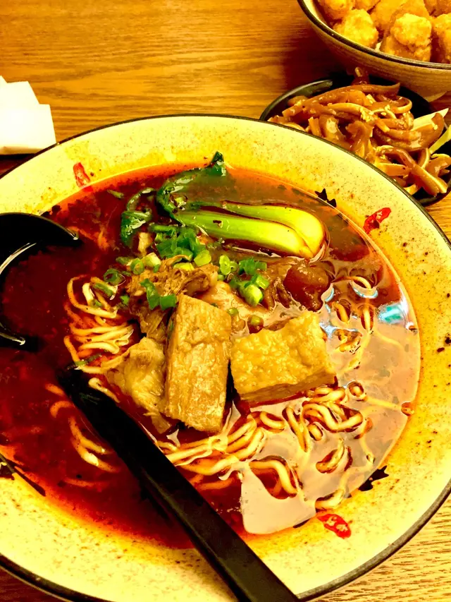 Walking in it was bustling and had that noodle house feel. The big glass windows with the chefs kneading and cutting the noodles and making the dumplings. Ordering was done scanning qr code and I ordered the spicy beef noodle. The noodles came out promptly with 2 kimchi side dishes and a small mouthful of sesame oil rice. The noodles were kinda more like Chinese noodles but lacking the al dente feel. The spicy soup had std shin ramen feel and the toppings of been sprouts mushrooms and leek with pieces of pulled beef. Nothing too spectacular. The size was filling though. The anticipation to go here outweighed the food quality though. …查看更多