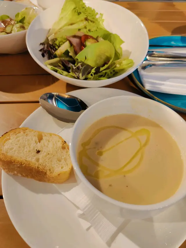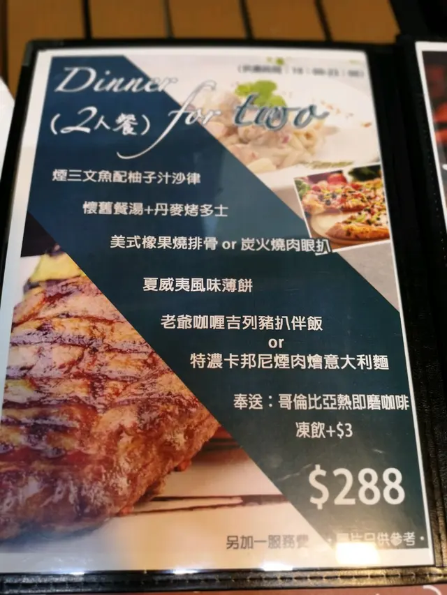 約朋友一齊食飯,見有新餐廳開,就去試吓,加上可以帶犬兒一齊去,我哋坐户外,天氣還好,坐得舒服,唔會覺得熱超抵二人餐 $288 煙三文魚沙律- 沙律菜非常新鮮 羅宋湯及粟米忌廉湯- 好飲肉眼扒- 5成熟, 剛剛好,肉質唔差,唔會鞋 Pizza - 餡料足夠薄底夠脆卡邦尼意粉- 比起其他餐廳個卡邦尼意粉好,份量不少哥倫比亞咖啡- 唔錯以上食物只需要288Ribs- 燒得剛剛好原條鰻魚配炒飯- yummy 咖哩牛筋腩配雪魚干飯- 咖哩做得不錯整體不錯,價錢好平,一定要再去幫襯!…查看更多