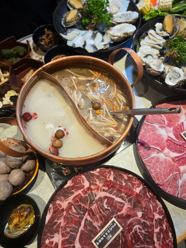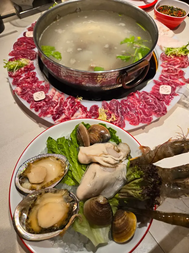 又到咗打邊爐嘅季節喇,鍾意食牛嘅朋友 一定唔可以錯過呢間餐廳,潮式火鍋概念以鮮牛肉作為主打。唔單只係新鮮咁簡單仲要係人手即場手切,滿滿的誠意。入座後職員馬上安排預設的牛肉拼盤及送上海鮮拼盤。拼盤內嘅手切牛吃完後亦都可以用手機落單無限任點: 五花趾/吊龍/匙抦/雪花/牛胸油。 個人最喜歡五花趾, 有筋又有肉,口感較為爽口,肉味濃。贈送中嘅海鮮拼盤竟然有咁大隻蠔,勁開心,軟綿綿口感勁juicy。自助吧有熟食也有火鍋配料提供,配料款式齊全,分門別類擺放好,整體食材都係非常新鮮。蜆係任攞,海鮮愛好者有口福了。個人亦非常推介餃,韭菜鮮牛肉餃/芹菜豚肉餃,皮薄餡靚,能吃出事新鮮包製的。用餐當晚係平日,都如此爆場,質素確實有返咁上下,今餐相當滿意。…查看更多