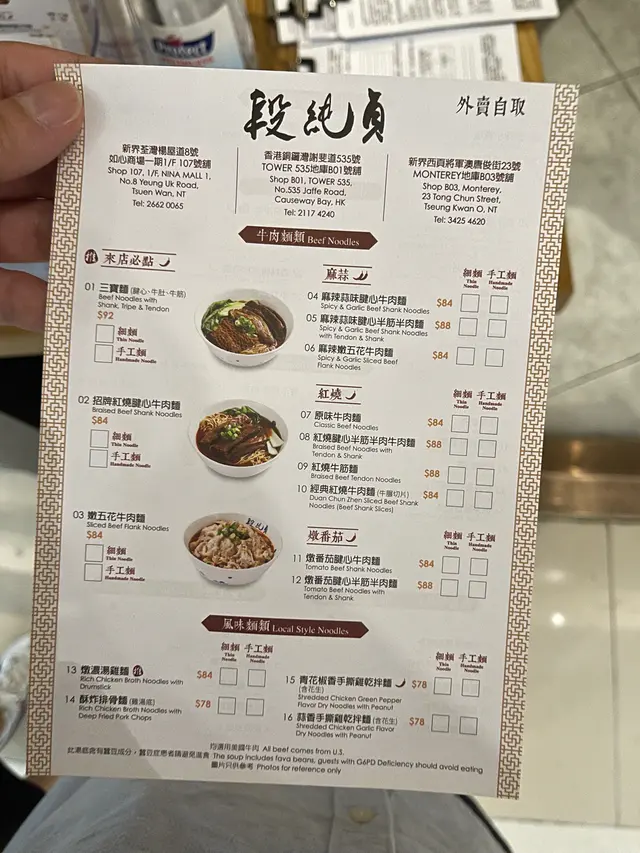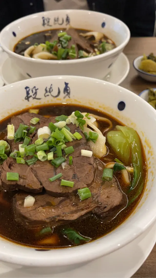 經典牛肉麵 段純貞的經典牛肉麵採用紅燒湯底,以牛油搭配花椒等多種辛香料炒製,再加入牛骨熬煮 8 小時,讓湯頭濃郁厚實,帶有微辣麻香的層次感。牛腱肉經過 2 小時的滷製,肉質軟嫩,入口即化,搭配手工製作的麵條,口感彈牙,吸附湯汁後更添風味。 三寶牛肉麵 三寶牛肉麵結合腱心牛肉、牛肚、牛筋三種不同部位的牛肉,讓食客一次品嚐多種口感。腱心牛肉軟嫩多汁,牛肚彈牙爽口,牛筋則帶有膠質,入口滑順。湯底同樣以牛骨熬煮,搭配秘製香料,讓每一口都充滿濃郁的牛肉香。 排骨湯麵 除了牛肉麵,段純貞也提供酥炸排骨湯麵。排骨經過獨特醃製,再以高溫炸至金黃酥脆,外皮香脆,內裡仍保有肉汁。搭配濃郁湯底與手工麵條,形成豐富的層次感。這道料理深受喜愛,特別適合喜歡酥脆口感的食客。 段純貞的牛肉麵不僅講究食材,更注重湯頭與麵條的搭配,讓每一碗麵都充滿層次與風味。如果你熱愛台灣牛肉麵,這家店絕對值得一試。 …查看更多