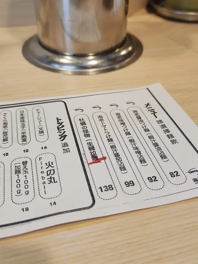 今日3號風球又唔想留喺屋企,唯有出去試吓海老名的沾麵(想試咗好耐)。去到長沙灣其實都有啲難搵,因為門牌比較簡潔。但皇天不負有心人終於搵到😅我地未開門入去,個店員已經衝出嚟招呼我哋入去坐🤭入面好有日本feel,播著日本歌曲,座位亦只有數個。一坐下店員即為我們介紹,並說蠔麵已經賣完了因一天只有五碗。於是我們點了兩客沾麵(蝦汁味噌沾麵和蝦汁醬油沾麵),看著店員在前方煮麵的時候好似好似置身於日本。當蝦麵汁送上時賣相相當美觀和吸引,其次就是一碟的沾麵。店員告訴我們吃之前要把麵汁先攪勻,又或者可以加少許蝦油醋提鮮,試了兩啖湯汁好味而不鹹!第一啖吃入口時... 嘩不得了!面質煙煙韌韌再配合蝦汁味噌真的很好吃哦!叉燒用火炙過夠野味又香口,蛋仍是流心好吃👍但係最特別的是櫻花蝦,我覺得這裡的櫻花蝦和外出吃到的是有點不一樣,這裏的櫻花蝦口感好飽滿紮實(不是薄薄的那種)。而當你吃完整碗沾麵的時候,店員會加幫你加熱湯,當湯飲又是另一種嘅享受和層次(我們連湯都喝光)。😂😬🫡下次必定提早去試它們的蠔麵!😁🥂🤟…查看更多