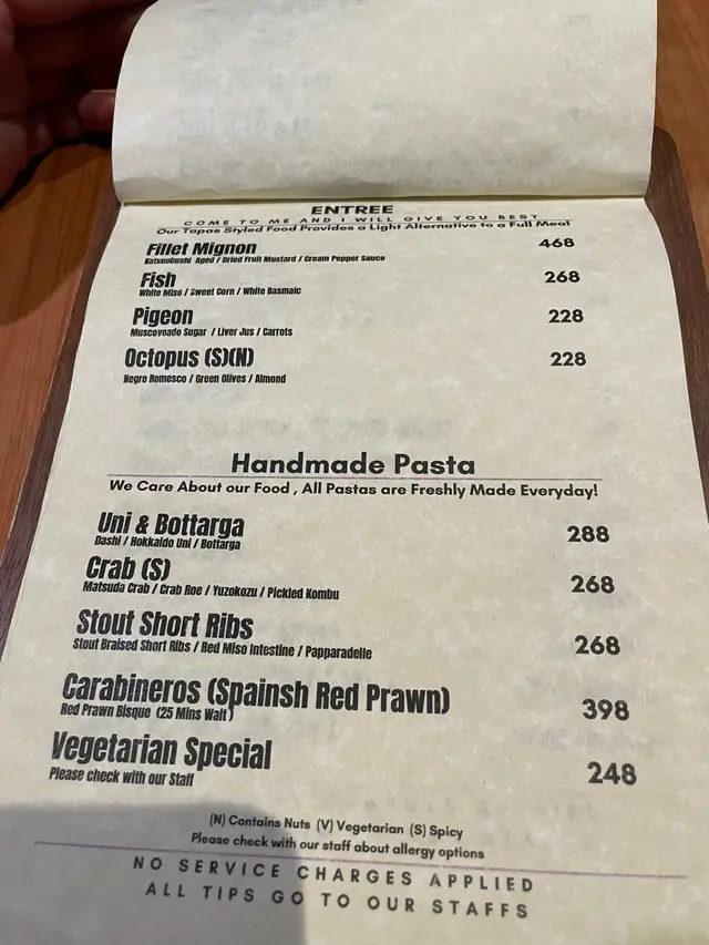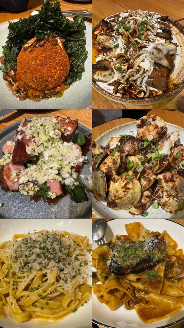 Everyone had a different favourite from the succulent ox tongue with crunchy onions, to the hint of chili on the eggplant covered in worm like rice crispies, to the fresh clams with a kick of sambal. The foie gras mini burgers were decadent with a perfectly paired chocolate sauce and hint of Asian flavour from the duck floss. But the burrata coated in tomato powder takes the top spot oozing with a surprise tom yum centre. Pastas were all excellent too. We recommend the crab pasta which was light and well balanced with yuzu. Skip dessert and have another starter instead. The tiramisu was good but perhaps a little too boozy for my taste. …查看更多