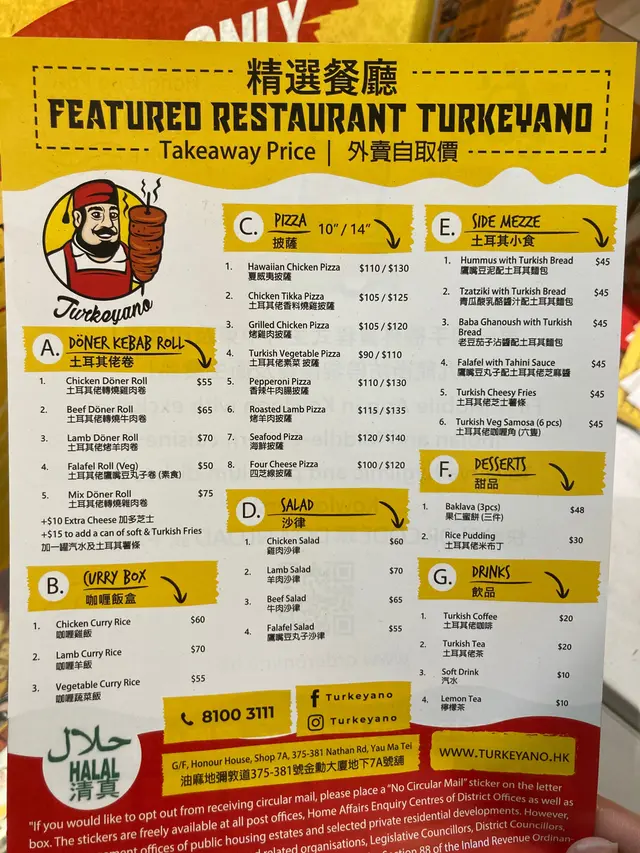 夜晚學完琴, 自己一個喺佐敦度周圍行諗緊食啲咩好,當毫無頭緒嘅時候見到有一片黃色嘅外牆, 原來係土耳其卷小店, 小店嘅外牆非常之吸睛,我忍唔住去睇吓有啲咩選擇原來除咗土耳其卷,仲有埋咖喱飯、沙律pizza等等.......平時平時食土耳其卷嘅餐廳更加多選擇最後我揀咗香辣雞卷等咗大概15分鐘左右我就可以取雞卷,價值$60嘅雞卷非常大條咩啊打開,已經聞到好香嘅烤雞味臨出門口時先發完原來有套餐,不過好少飲汽水嘅我都係揀返單點手卷好啦辣雞卷份量幾大,足以滿足我成個夜晚,而且唔食得辣嘅人都可以應付到佢嘅難,佢係香料味辣,特別惹味又開胃佢哋嘅黑色膠袋仲好型添啊…查看更多