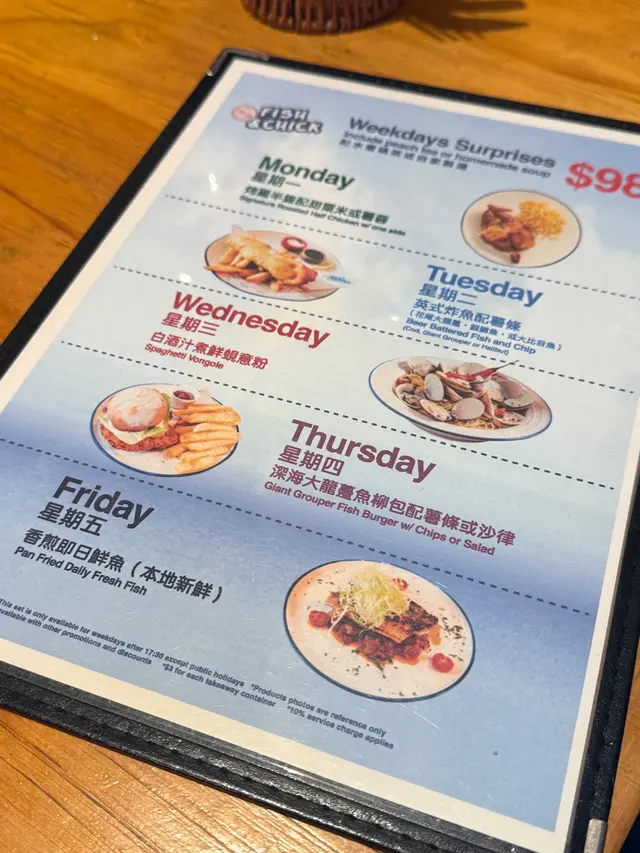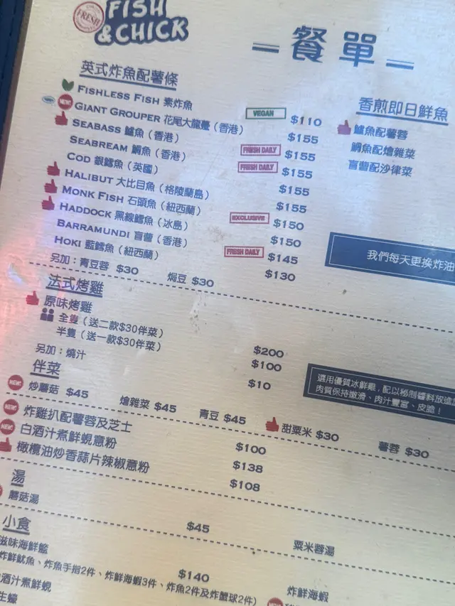 即叫即做炸魚😍 Fish & Chick (禧利街) 2025-09-29係上環經過呢間炸魚店,香港好少炸魚鋪頭就同朋友入去試下😬睇menu 好多款魚揀,我地就試下龍躉,因為我地都中意厚肉,店員都好好問我地中意厚身定薄身😍之後叫左個每日精選燒雞加薯蓉,98蚊好抵食甘😂😂再加多個小食-白酒煮蜆個炸魚薯條$155- 食落好好食,個炸粉唔厚又脆😍魚肉好厚實,無諗過龍躉炸魚係甘好食😋個薯條都係新鮮炸,好食,最重要食落口一d都唔覺得好油白酒煮蜆$120-d蜆又多又大隻,味道岩岩好,隻隻都好鮮甜又無沙😋起碼有十幾二十隻燒雞相比炸魚既就普通啲,燒得比較乾身,唔夠juice,但跟餐既粟米湯好好飲,會飲得出佢將新鮮粟米碎煲出泥既湯👍🏻👍🏻👍🏻👍🏻…查看更多+ 2以上食记乃用户个人意见 , 并不代表OpenRice之观点。赞好分享即叫即做炸魚😍 Fish & Chick (禧利街) https://s.openrice.com/QrbT0BvrU00检举 张贴 评分5味道5环境5服务5卫生5抵食推介美食花尾大龍躉用餐途径堂食