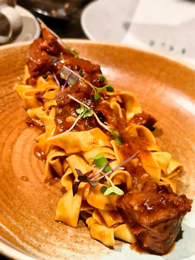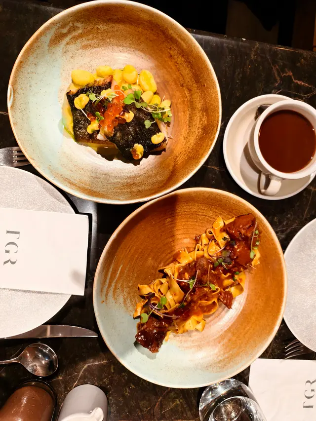 同朋友喺尖沙咀行街,揀左呢間高級西餐廳食晚飯,好彩一早book 左位,呢間餐廳好full。餐廳係高格調的暗燈裝修,好有氣氛,好多食客都係情侶。我同朋友都唔太餓,所以叫左2個main同飲品。🐟香煎黑鱈魚配鹹蛋紅花忌廉汁($268)魚皮煎到好香脆,魚肉好滑,易入口。魚上面配有魚子,成個口感提升左。個汁係好特別的鹹蛋紅花忌廉汁,同平時d西餐汁好唔同,鹹鹹地好配食魚。配菜係炸過的豆,好少有咁既配搭,雖然豆係炸過,但冇加好濃的調味,唔會搶左條魚的味道👍👍🐟燴蕃茄牛面肉闊意粉($188)手工意粉係意式口感,唔會太淋,有少少咬口。牛面肉煮到好淋好易咬,配上蕃茄汁好開胃。🐟朱古力($42)凍朱古力都配左杯糖漿比我,不過本身夠晒味,唔洗加糖漿。…查看更多