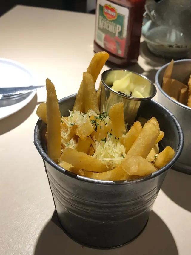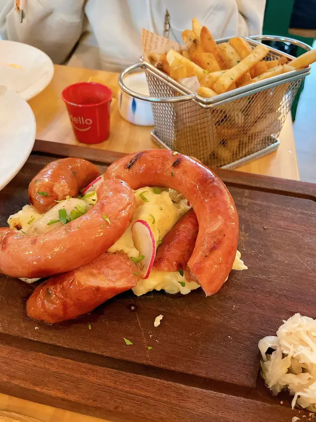 過去唔難,搭鐵到奧運站C1出口行好快到。價錢還好吧德國腸拼盤$78有4款腸,唔乾身,底部仲有薯蓉,解膩薯條配松露蛋黃醬$48醬既味道唔夠濃,松露味好淡蛋黃味唔太食得出,可以再濃啲,另外仲俾咗番茄汁。但薯條夠粗有口感,唔會炸得太燶白松露雜菌芝士薄餅$98可以一試,餅底夠薄夠脆,味道唔鹹,蘑菇大細啱啱好,不過我私心想芝士再多DD🤌同埋我會鐘意餅底再厚DD🤌私心🤣環境座位太埋,肥妹肥仔路過要小心~利申我都係肥妹😅…查看更多