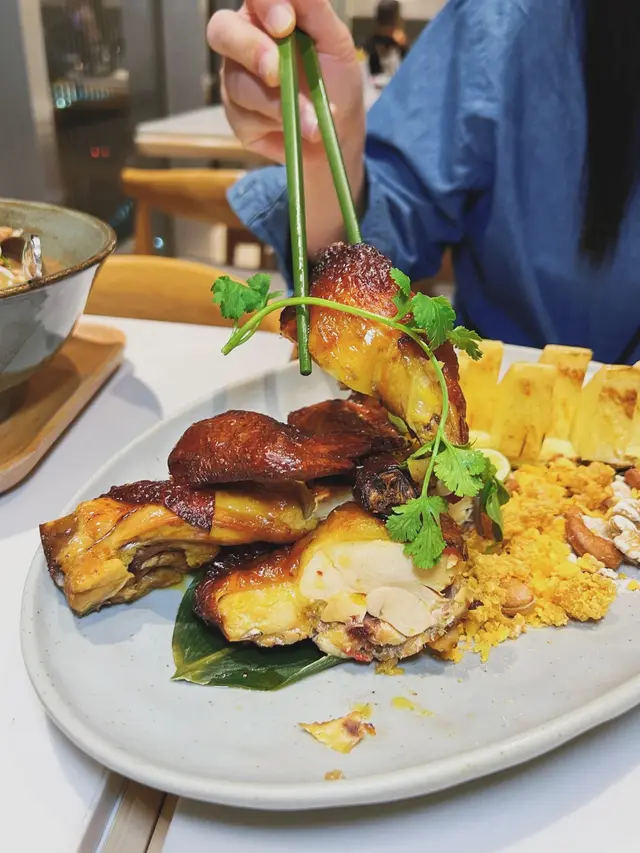 餐廳主打泰西ꜰᴜꜱɪᴏɴ菜,裝潢以西式田園風為主,座位舒適🌴🫶🏻✂︎❥$𝟱𝟴 泰香葉墨魚餅/2件:切開後清晰可見墨魚顆粒,真材實料,鮮甜彈牙,沾上泰式辣醬滋味十足👍🏻✂︎❥$𝟲𝟴 阿閒泰虎蝦冬蔭功湯:酸酸辣辣的冬蔭功非常開胃,有兩隻爽彈新鮮的虎蝦、肉質滑嫩的青口,還有不少的蘑菇🦐🍄🟫 雖說是一人份量但滿滿一碗兩人ꜱʜᴀʀᴇ也很足夠😉🫶🏻✂︎❥$𝟭𝟴𝟴 棕櫚糖炭燒三黃雞/半隻:外皮烤得香噴噴帶點棕櫚糖的甜,雞肉有嚼勁但不過硬,金黃色的雞皮和雪白的雞肉形成對比🐥 伴碟還有爆汁的烤菠蘿、香脆的果仁🍍🥜✂︎❥$𝟴𝟴 豬船麵:濃郁的湯底有豬肉、豬潤、豬肉丸、肉碎、豬紅🍲 爽滑的麵條夾雜著大量清爽的芽菜,口感豐富✂︎❥$𝟴𝟴 香辣炒通菜:充滿香氣撲鼻的蒜香味🧄✂︎❥$𝟱𝟴 香芒紅菜頭米紙卷/4件:米紙卷除了紅菜頭外,也有紅蘿蔔絲、芒果果肉,清新又健康 ✨…查看更多