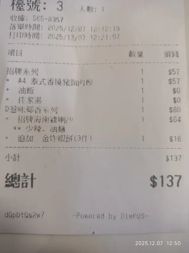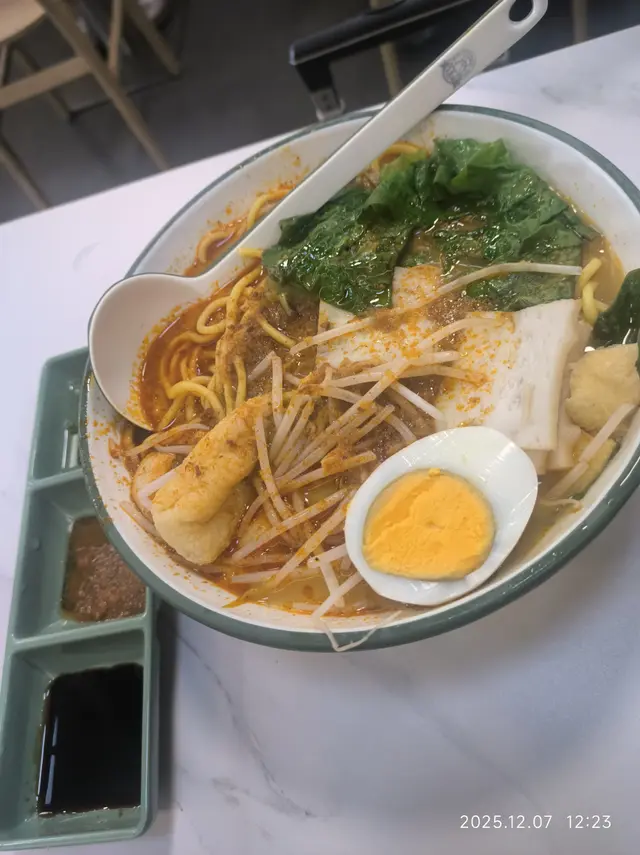 此店雖其貌不揚但其實頗有内涵。今天十二時前到店,還有空座得到卡位,建議各位早點到,因為一瞬間已座無虛蓆,三人的午餐叫了兩道菜,分別是海南雞喇沙及燒豬頸肉油飯再加配炸蝦餅。先來是海南雞喇沙,雞肉份量大得來很壯觀,皮較厚不膩且肉很滑,而碗油麵底也十分多夠三人分享,湯不算大咸但因為叫了少辣在香料味方面降減了。再來的是豬頸肉油飯,豬頸肉不遑多讓的多,因為是燒製的很有嚼勁(不加鬆肉粉),但算幾新鮮及味道尚可,油飯size就細了點不過跟肉沾上汁料就是絕配。整餐三人吃得很滿足又只百三多元頂級經濟,是由於區內食肆林立競爭劇烈的原故吧。…さらに見る