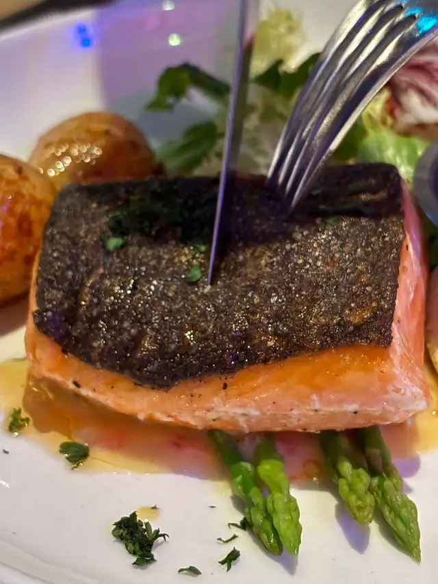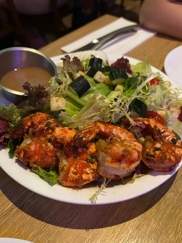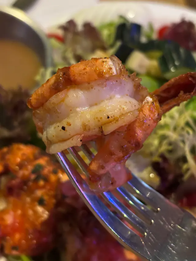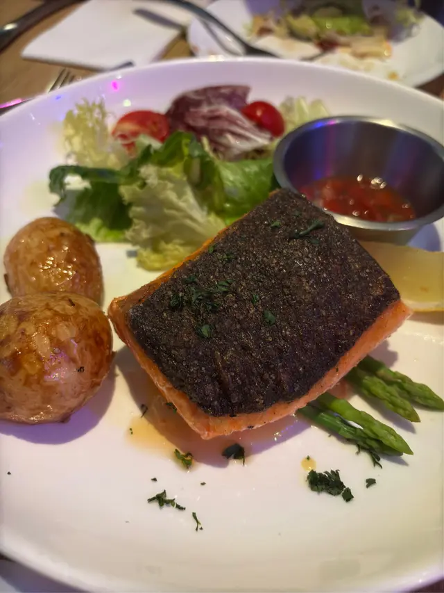 銅鑼灣人氣西餐廳 The Musicbox Grill House & Bar 2025-08-13晚市全場爆滿,氣氛唔錯!廚師沙律加卡珍蝦,沙律新鮮,材料有青瓜、沙律菜、小蕃茄,搭配得非常好,配搭黑醋醬,味道剛好!卡珍蝦鮮味十足,香濃,咬落嫩滑香煎三文魚,配龍舌蘭檸檬汁,三文魚煎得啱啱好,外面有好脆,裡面又保持住魚肉既鮮嫩,龍舌蘭檸檬汁添咗啲酸酸嘅味道,令整道菜更加有層次。配菜有小蘆筍、焗薯同沙律菜,不錯!經典嘅炸魚同薯條。魚肉外皮炸得香脆,裡面好滑,配上酸沙律菜同他他醬,味道真係好夾。薯條炸得金黃酥脆,唔油膩,搭配番茄醬,好味!…查看更多+ 4以上食評乃用戶個人意見 , 並不代表OpenRice之觀點。讚好分享銅鑼灣人氣西餐廳 The Musicbox Grill House & Bar https://s.openrice.com/QrbT0U01U00檢舉 張貼 評分5味道5環境5服務5衛生5抵食用餐途徑堂食