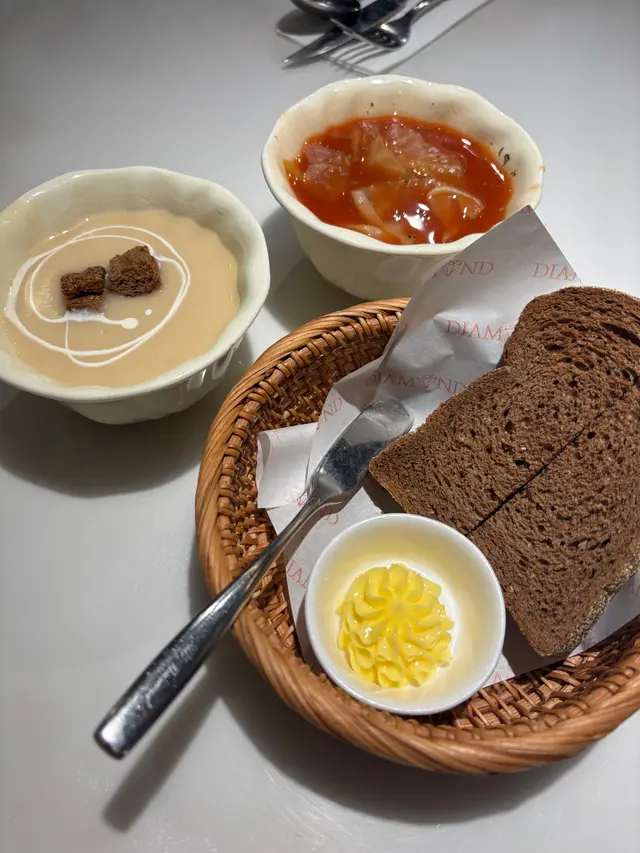 豐富又款式多既西餐 THE DIAMOND RESTAURANT 2025-01-19今次嘅午餐真係唔錯!餐前有脆脆既多士,配搭羅宋湯同薯蓉湯,兩款湯都好好味,羅宋湯有酸甜嘅味道,而薯蓉湯則濃郁得來又香滑。凱撒沙律生菜脆口,配上香濃嘅凱撒醬,仲有啲烤麵包丁、芝士碎,整體唔錯牛柳伴燴薯菜,牛柳煎得啱啱好,鮮嫩多汁,搭配啲燴薯菜,味道非常好,真係好滿足!雙重芝士手搓安格斯牛肉漢堡,芝士味濃郁,安格斯牛肉多汁,好味,有青瓜、生菜,配上脆脆嘅薯條最後,Tiramisu口感滑溜,咖啡酒味香濃!仲有飲咗檸檬佛手柑鐵觀音茶同意式泡沫咖啡整體來講,呢餐午餐都抵食,食得開心!…查看更多+ 4以上食評乃用戶個人意見 , 並不代表OpenRice之觀點。讚好分享豐富又款式多既西餐 THE DIAMOND RESTAURANT https://s.openrice.com/QrbT09vnP00檢舉 張貼 評分5味道4環境5服務5衛生4抵食用餐途徑堂食
