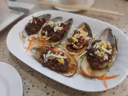 ,還佐以紫洋蔥及香芹,當作些沙律也可以啊。套餐包了個冷盤,所以,散點就選了一道小食「泰式咖喱芝士焗青口」($78),一客有六隻,剛好夠我們三個分,青口之上放了好些泰式咖喱及芝士,吃來極為香濃惹味