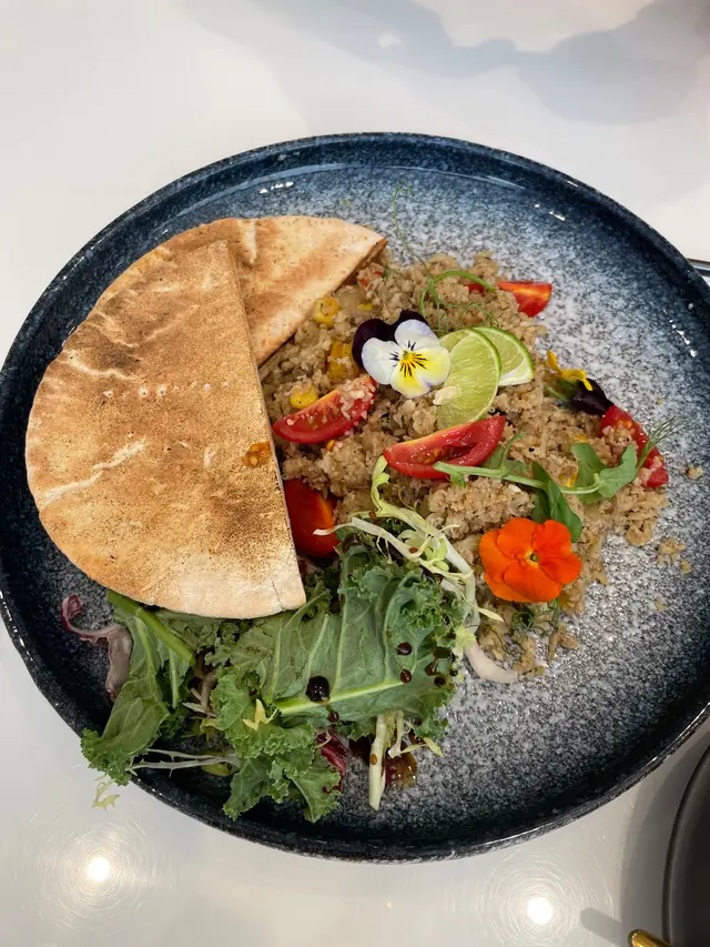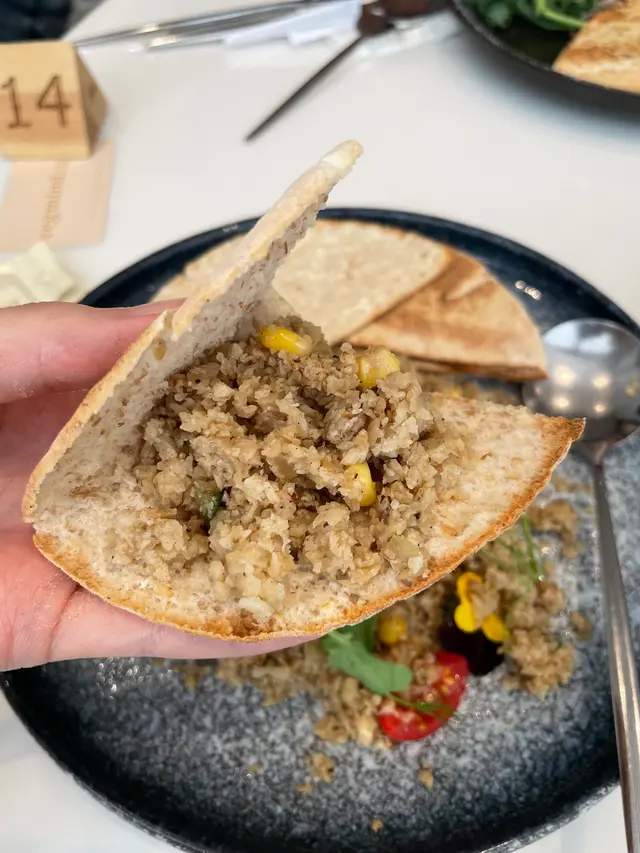 餐牌如下,佢有餐既可加$10要普通飲品,例如凍檸茶果d 我地叫左VMC菠蘿青檸炒椰菜花飯(中東包)$87賣樣不錯,幾靚不見有菠蘿🍍我估無貨轉左粟米不過係好食既不過個中東包一打開就爛,包唔到入去要分開單塊食😆另一個係牛油果芫茜芝士蕃茄莎莎墨西哥夾餅$88,好足料兩個比較下,個人鍾意食中東包多啲