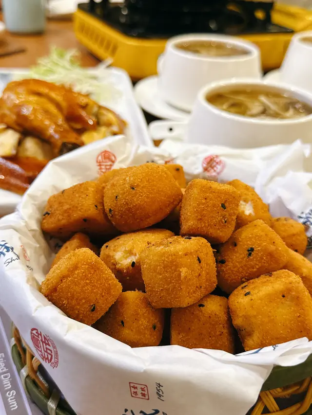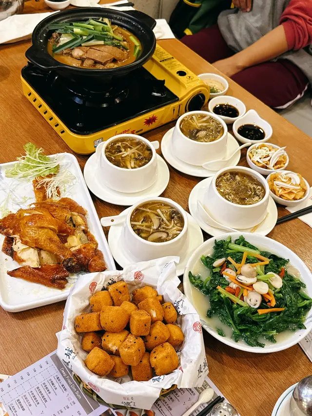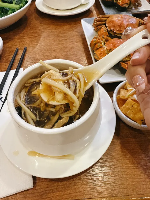 而家有大閘蟹宴,人均$250左右首先係太史五蛇羹。呢個天氣飲真係啱哂,夠熱辣辣,湯羹唔會太稀或者太厚,料都算足,有蛇肉絲、木耳絲之類,飲完成個人暖笠笠,個胃好舒服。味道調得幾好,唔會太鹹或者落太多胡椒搶味。跟住係一口金磚豆腐。炸得幾靚仔,外皮好薄好脆,入面嘅豆腐依然好滑。點埋喼汁食,係幾香口嘅一道前菜。時令大閘蟹(四隻),一人一隻。上檯嘅時候望落都幾大隻,蟹膏金黃香濃,蟹肉甜。魚湯杞子浸豆苗呢道菜我好鍾意。個魚湯底好夠味,好鮮甜,完全冇腥味,浸住啲嫩綠豆苗同幾粒杞子,食完濃味嘢之後食返啲菜,清清地又好飲,覺得好健康。秘制羊腩煲份羊肉炆得夠淋夠入味,羶味唔會過重,個汁濃稠適中,幾好送飯。脆皮炸子雞(半隻),皮真係炸得脆,雞肉嫩滑,唔會乾。最後每人有一碗驅寒薑茶,夠薑辣,飲落好暖胃,為成餐飯作結就最適合不過。總括來講,$888 四位,有蛇羹、有大閘蟹、有雞有羊有菜,都唔錯…查看更多