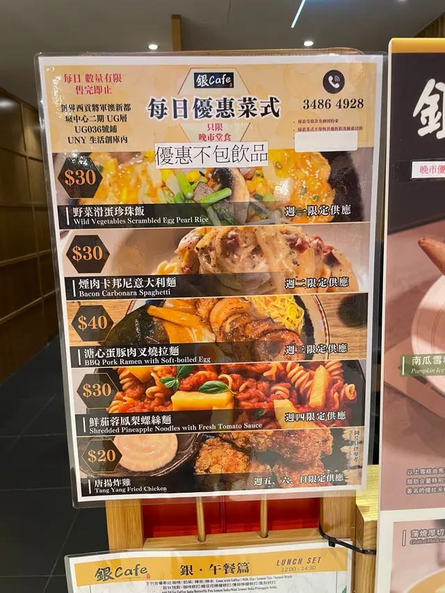 今次呢間餐廳名為’銀Cafe’.原來係因為佢哋會請銀發一族作為店員,令佢哋能夠與社會接觸,亦能夠賺返些少.餐廳係新開,依家有新張優惠,逢星期一至五晚餐特選只係$30. 其他菜式主要係西日fusion,有啲都幾特別. 譬如有一個係雪糕加意粉,不過今日天氣凍,留返下次先試。揀咗一個正價Menu嘅咖喱太陽雜菌和牛粒飯,同埋晚餐特選煙肉卡邦尼意大利麵.咖喱和牛粒飯唔錯,選用嘅係日式咖喱,唔辣而且帶甜.和牛粒份量唔算太多,但都夠食.個煙肉卡邦尼意大利麵就有啲失望,食落似係好稀嘅牛奶汁… 望吓餐牌原來正價都要成$90(連加一).呢個價錢同質素根本唔成正比.好彩係晚餐特選嘅時候試咗,如果以$30嚟講,都食得過.但正價一定唔會再點.…查看更多