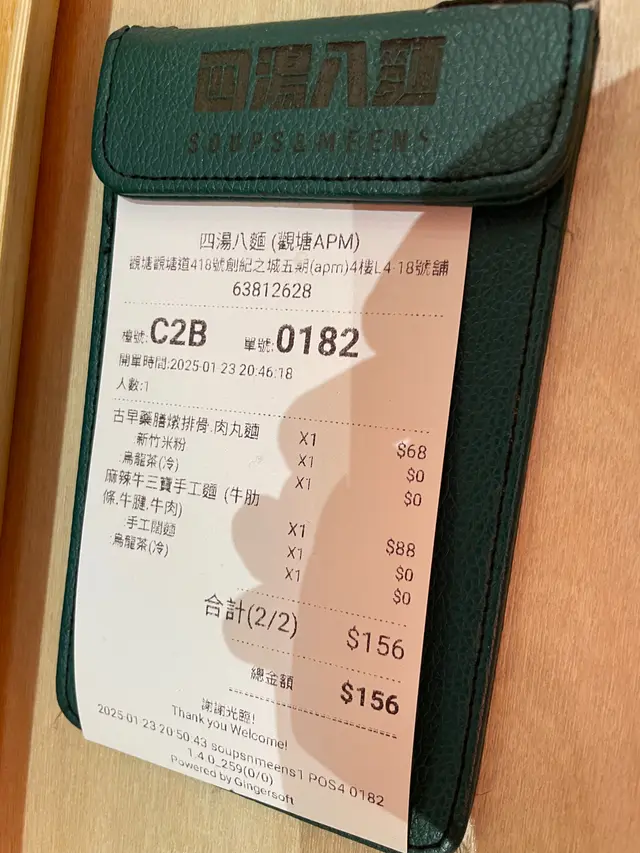 夜晚八點幾,入咗去呢間四湯八麵食飯.叫咗個古早藥膳燉排骨肉丸麵配新竹米粉,同埋一個麻辣牛三寶手工麵.個藥膳排骨新竹米粉5分鐘到上枱,但麻辣牛三寶面明顯漏咗單,等咗20分鐘仲未有,問吓店員,店員好炆憎,亦不斷推搪話整緊,又好嘈咁話人手唔夠,結果成半個鐘先至嚟到.睇返佢哋廚房有三個人,樓面有兩個人,唔覺得唔夠人手.其實佢老實講漏咗單咪得囉,都會包容佢.最令人激氣嘅,係個牛三寶手工麵嚟到之後入面啲配料係凍嘅😱!!條菜又未淥熟😵‍💫!!完全唔掂, APM入面有咁多選擇,下次唔會再嚟.…查看更多