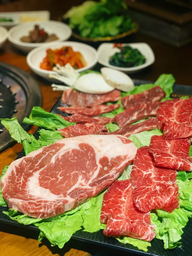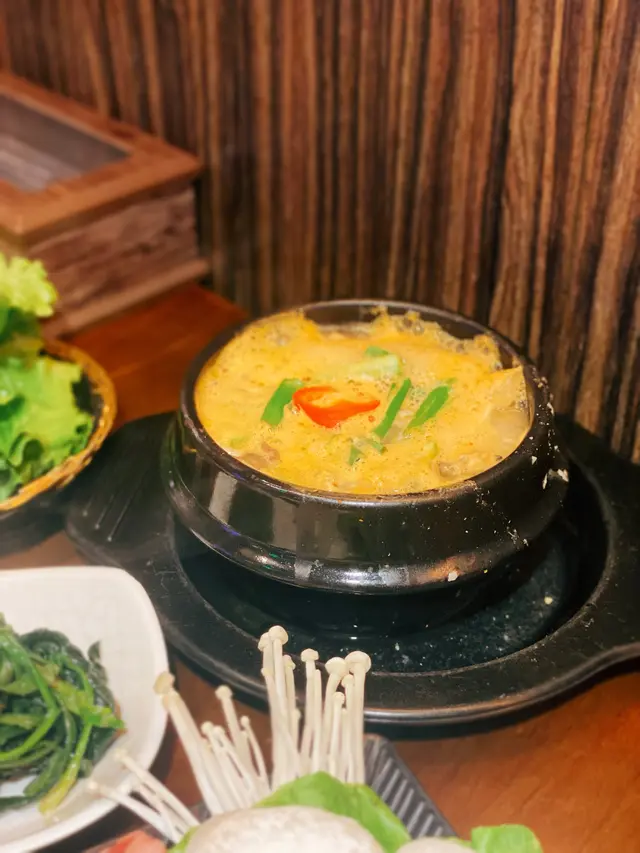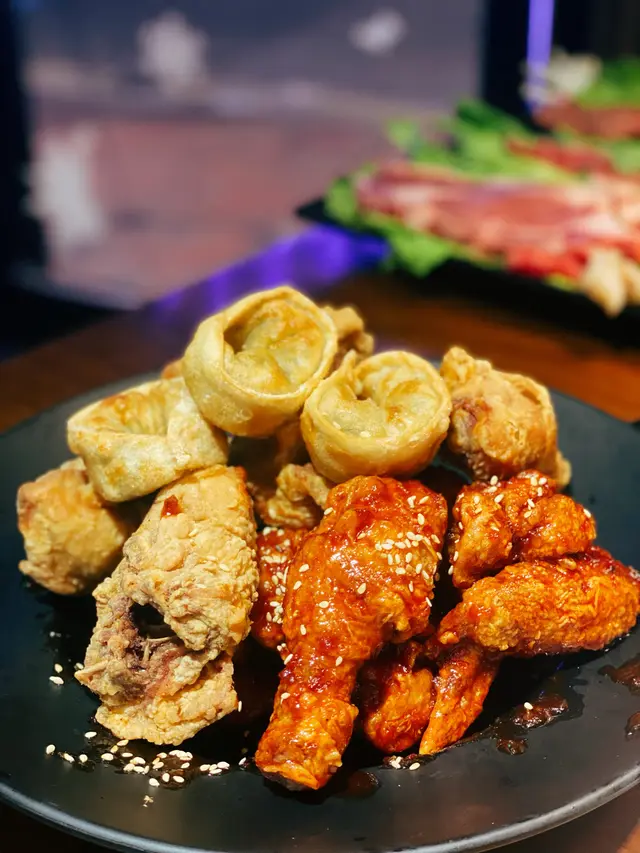 餐廳裝修幾有韓國feel,當晚仲有好多韓語食客光顧,環境即刻好有feel 😈✨餐廳食物款式好多,又可以食韓燒、炸雞、鍋物、小食等等😎我地揀左韓燒但係又想食炸雞一樣冇問題😆✨🎈半半炸雞(原味&甜辣醬)$190除咗有兩款口味嘅炸雞,仲有四粒炸韓式餃子,一樣好滋味😋炸雞係新鮮炸起,好juicy,最緊要係連雞胸位置都唔會好乾,熱辣辣食真係超滿足😉🎈牛肉拼盤 $530韓燒拼盤已經有齊四款牛肉:肉眼扒、牛肋骨肉、肩胛肉同埋板腱肉。仲包埋一個泡菜湯或者大醬湯😋估唔到個大醬湯咁足料,除咗有豆腐,仲有好多海鮮👍🏻👍🏻…查看更多