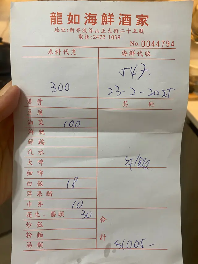 今天我跟一位朋友去食飯,兩個人每人各食了一隻鮑魚一個帶子一隻大蝦同埋一砵蠔,仲有一碟$100嘅生菜,埋單竟然係$1005問佢攞明細單只有手寫冇電腦單提供。我哋叫的海鮮只有一個總數冇細分嘅數,仲以為佢哋有自家嘅海鮮檔會平啲問佢的價錢只有講幾多錢一斤冇講秤嘅多少斤條數都唔清楚,問佢睇所謂嘅手寫單,只寫了海鮮嘅總價錢547 ,而且仲有加工費300一碗白飯都要成$18紙巾醬油費$10 。以為食到咁貴可以碌卡啦佢就話要收3%嘅手續費咁我只好攞現金出嚟埋單。最初門口寫住免+1所以吸引咗我哋入去食飯,點知原來中伏咗雖然啲食物都唔錯,但係價錢感覺亂嚟存在欺騙,所以唔會有下次!差評…查看更多