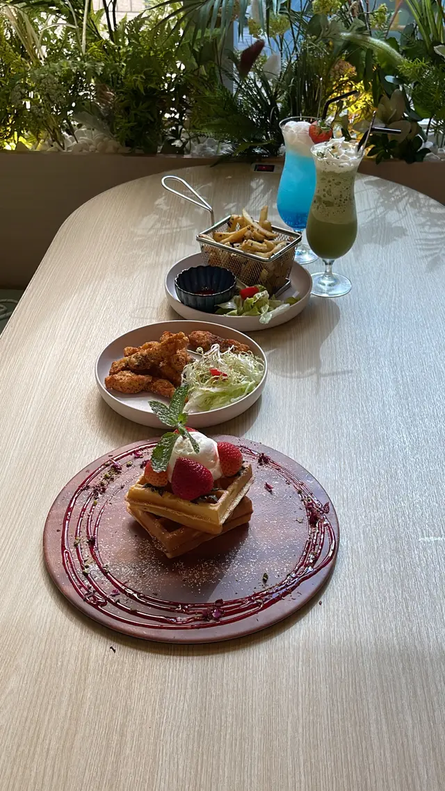 ☁️ 觀塘又有leng leng 餐廳,主要用咗黃色和綠色作為裝飾主色,加上插滿了花和草的飾物,好似入咗花花森林。當日星期六下午2:30去到,剛好碰到太陽曬入餐廳的時候,但餐廳玻璃都貼滿了防曬貼,有充足陽光但係又唔會曬親!當日餐廳不是太多食客,所以坐得特別舒服。可能因為餐廳位於辦公室大樓,所以週末就不是太多人。大家最好Whatsapp book 定位!職員都好好人,臨走前仲送咗杯相片打印咖啡☕️。食物份量恰當,當日叫了兩份小食和一個甜點。特別想說一說麻辣脆雞條,雞條不會太乾,喜歡麻辣嘅朋友一定要試!特飲都好精美,好適合打卡! ▼・ᴥ・▼麻辣脆雞條$68黑松露薯條 $48 夏之 waffle$88宇治抹茶沙冰 $58藍橘子雪糕梳打 $58@msstephanie_skyblue…查看更多
