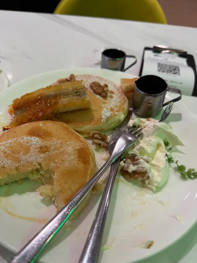 第一次來吃,看見餐牌滿期待叫了焦糖香蕉pancake,端上來的餐外貌不錯可惜切了第一刀已心知不妙,pancake是實的像提子麥包,食不下。通知服務員,她說不如再整過一份,等15分鐘,我同意。及後第二份只是比好少少,但實實的麵漿真的很難消化,還有點麵粉生生的味道,只吃了一點便放棄。服務員過來問我怎樣,我說配方跟預期很大出入,她說店舖開業以來就是這配方,說要給客人吃飽肚一點!對她的解釋我無語,亦不想爭辯。原來pancake不是求鬆軟,是求飽肚!長知識!…查看更多