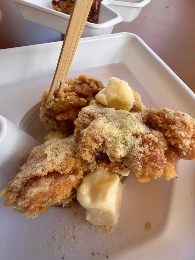 當日係復活節假期最後1日,行過俾座地易拉架吸引咗,圖片係杯上有炸雞,杯中有凍飲😍。店內只有一位男店員,尚算勤力,當日店舖冇乜客,反而隔離茶飲店排長龍。我同朋友order咗2份小食杯,選擇芝士炸雞配芒果Milky Soda、甜辣炸雞配蜜桃烏龍茶,等咗10零分鐘,可以取啦,但發現飲品冇冰,我詢問店員,佢回答店內沒有冰塊,當日氣溫接近廿幾三十度,飲品有冰會好啲,佢都非常好,即刻過隔離茶飲店借冰粒,片刻後佢拎住裝滿冰粒嘅杯回來,真係好服務👍🏻,凍飲感覺即刻唔同晒,本身飲品偏甜,加冰後好飲好多。至於炸雞味道,兩款炸雞皮脆肉敕,芝士炸雞的芝士粉及芝士醬好好味,又香又甜,而甜辣炸雞嘅醬汁調教得好惹味,仲落有粒粒芝麻,加添口感,雖然係叫甜辣炸雞,但唔覺有辣味,好啱我唔食得太辣嘅人。小食杯內有3件炸雞配凍飲,價錢每份$68。覺得有少少貴,但可以接受而且好好味。原來旺角朗豪坊有分店,供應放題,好想搵日去試吓🤭😋😋😋。Remarks : 圖片飲品唔滿嘅係冇冰狀態,另一幅飲品已加咗冰滿咗😂🤣…查看更多
