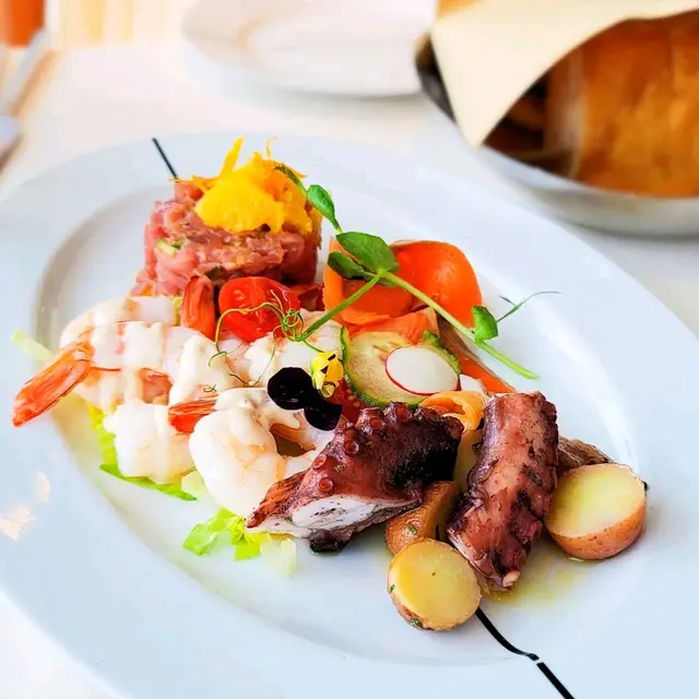 太耐冇出街,完全唔知應該去邊度食飯。沿途嘅餐廳唔係收咗,就淨係做外賣😔。行下行下就行到去世界嘅盡頭 (海運大廈)。唔係講笑,我真心覺得嗰度係尖沙咀最遠嘅地方😵講返間餐廳,見到佢有個 Brunch set,仲可以加 $99 free flow 紅白啤酒 sparkling🤩覺得都幾吸引,老婆話之前試過 dinner 都唔錯,咁咪諗住入去試下。點知原來 full booking,要排 walk in,好彩黎得早排第一個,等咗大概三四個字就可以入得。奉勸各位下次想去,記得先訂位。餐廳裝修基本上冇得輸, 樓底高,大落地玻璃,陽光充足,夜晚仲可以望到維港夜景,仲可以坐室外(當然要預先訂),打卡一流。可能因為二人一枱嘅關係,啲枱都係坐得比較密。侍應人手亦都明顯唔足夠。不過呢啲都唔係餐廳可以控制。員工嘅態度已經算好好,做到xx都冇黑面。講番食物,都算對得住個價錢,個set本身已經有曬頭盤、主菜、甜品。頭盤分別有 mixed seafood platter 同 cold cut。Tartare 好新鮮, 凍蝦就一般,個八爪魚好正👍🏻因為一入門口見到佢個 pizza 爐好正,所以Main course 叫咗 Pizza Edi,另一個就加錢要咗個西冷。個 pizza 冇令我哋失望,果然個爐係好重要。個西冷亦都煎得好好,係值得試嘅。甜品有 Panna Cotta and Tiramisu,果然係招牌甜品,甜度掌握得非常好,作為一個下午嘅結尾簡直係 perfect。另外都叫咗紅、白、sparking 各一杯,冇深究係咩酒,普通 house wine 易入口,同食物都夾嘅。總括嚟講好味、靚景、有酒飲,喺呢個時勢咁嘅價錢,算好好😋😋…查看更多