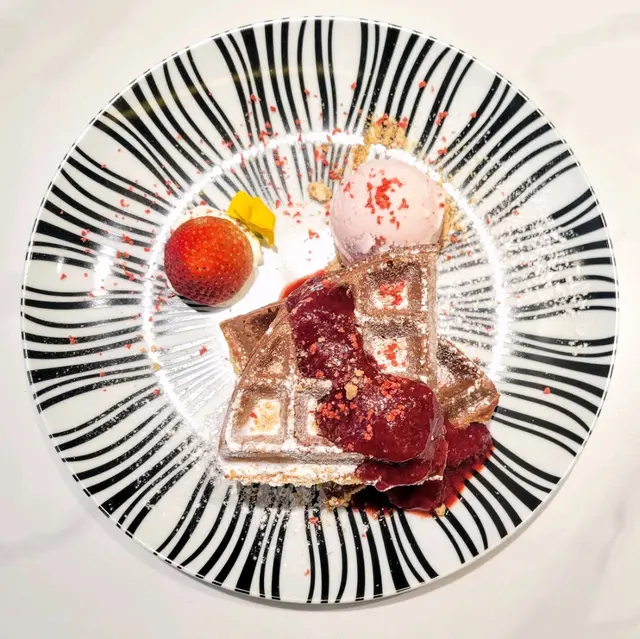 今日趁國慶跟友人買平戲飛,享受一下優惠,連睇兩場,未開始電影半馬之前,去灣仔食個靚午餐,尚有空間就搵咗間地點方便嘅cafe 噗個咖啡,睇到呢間非常新淨嘅cafe,就即管一試:)員工人數以cafe size 比例來說,是比一般cafe 多,位位態度殷勤,亦詳細介紹了食物,我地最後冇飲咖啡,反而order 咗dessert友人點了雪糕新地,我就點咗berries waffles,即叫即整,好新鮮,berry sauce 係即場整嘅,口感非常好,每張枱嘅擺設都有心思,欣賞!下次會再試吓其他食物及咖啡